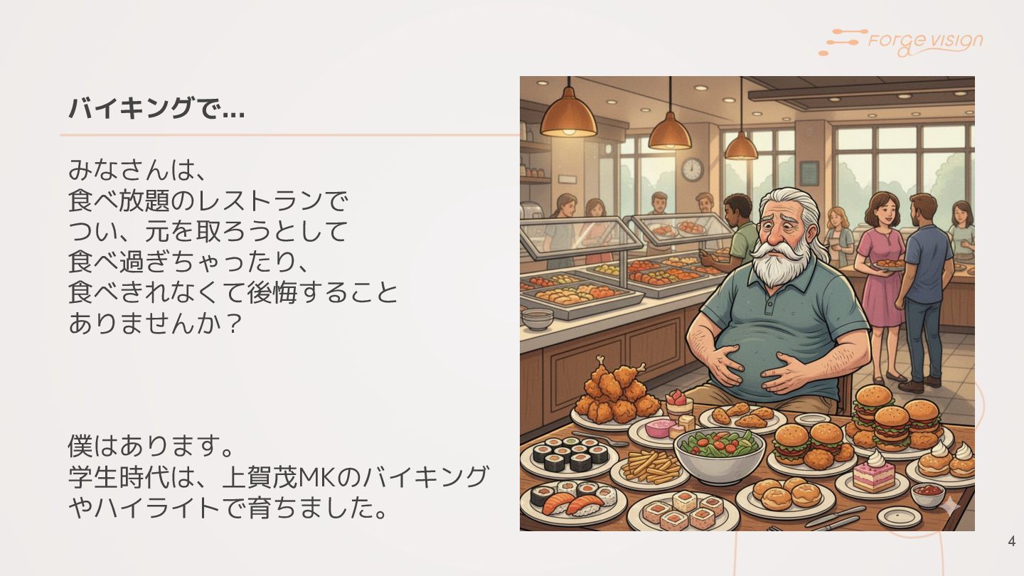4 バイキングで... みなさんは、 食べ放題のレストランで つい、元を取ろうとして 食べ過ぎちゃったり、 食べきれなくて後悔すること ありませんか? 僕はあります。 学生時代は、上賀茂MKのバイキング