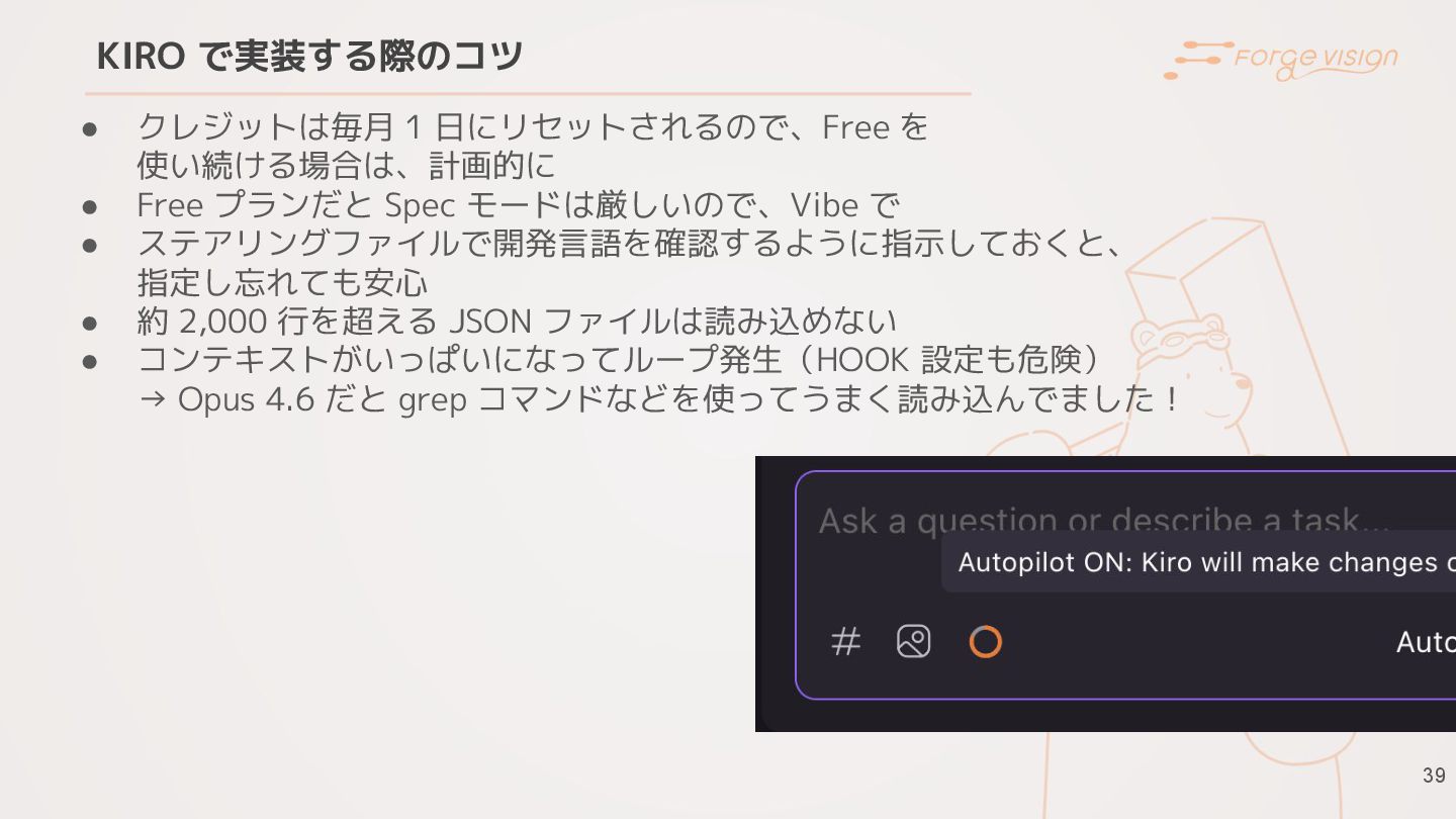 Free プランだと Spec モードは厳しいので、Vibe で • ステアリングファイルで開発言語を確認するように指示しておくと、 指定し忘れても安心 • 約 2,000 行を超える JSON ファイルは読み込めない • コンテキストがいっぱいになってループ発生(HOOK 設定も危険) → Opus 4.6 だと grep コマンドなどを使ってうまく読み込んでました!