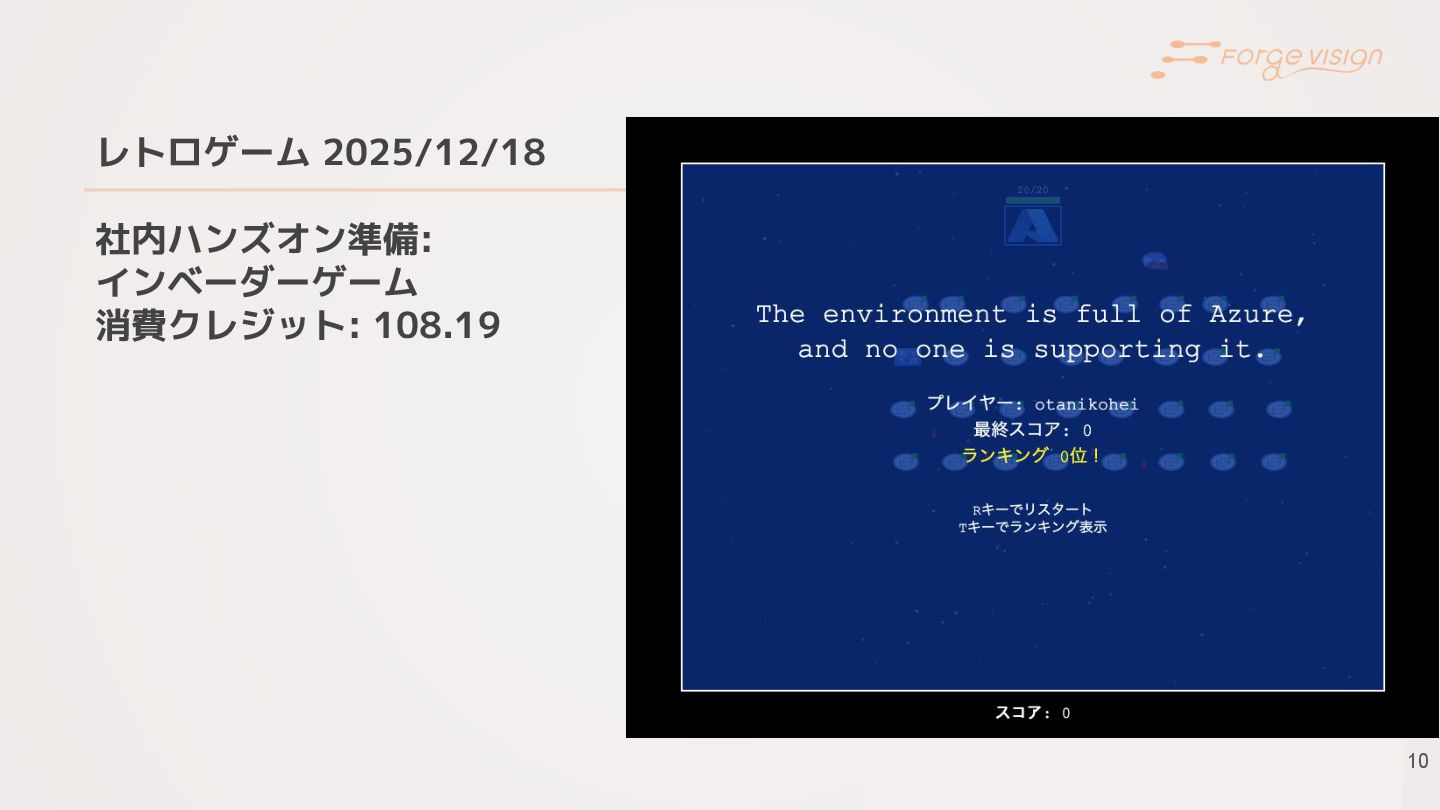 レトロゲーム 2025/12/18 社内ハンズオン準備: インベーダーゲーム 消費クレジット: 108.19 10