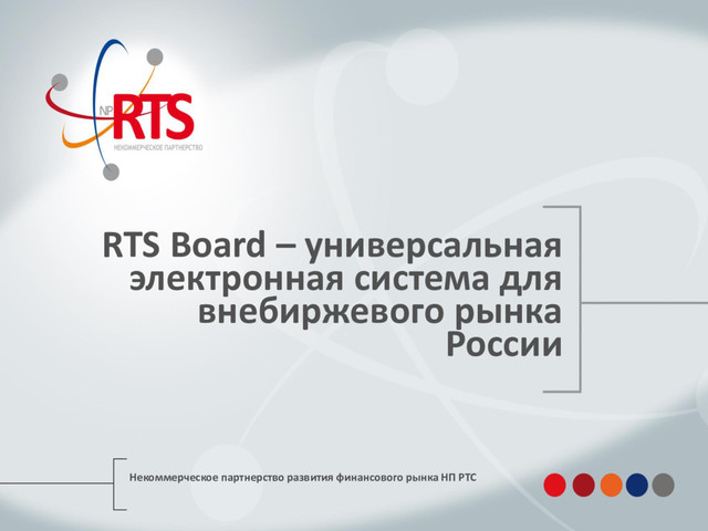 РТС заявки на получение доступа (по электронной почте или иным удобным способом) Получение из НП РТС подготовленного договора об оказании информационно-технических услуг, подписание договора Получение из НП РТС и активация логина и пароля для доступа в систему Получение в НП РТС сертификатов ЭЦП и ПО CryptoPro CSP (в случае их отсутствия) - для операций по электронному подтверждению RTS Board – универсальная электронная система для внебиржевого рынка России Москва