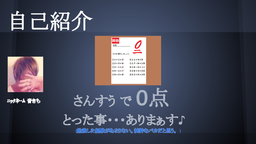 さんすう で 0点 とった事・・・ありまぁす♪ (勉強した経験があまりない。純粋なバカだと思う。 ) 自己紹介 ニックネーム 音きち