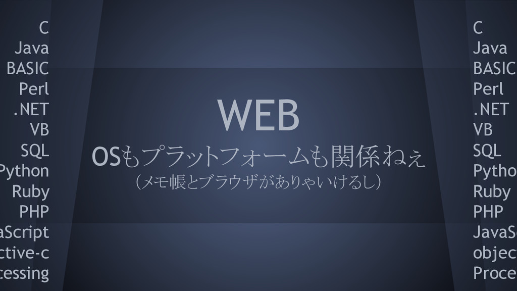 WEB OSもプラットフォームも関係ねぇ (メモ帳とブラウザがありゃいけるし) C Java BASIC Perl .NET VB SQL