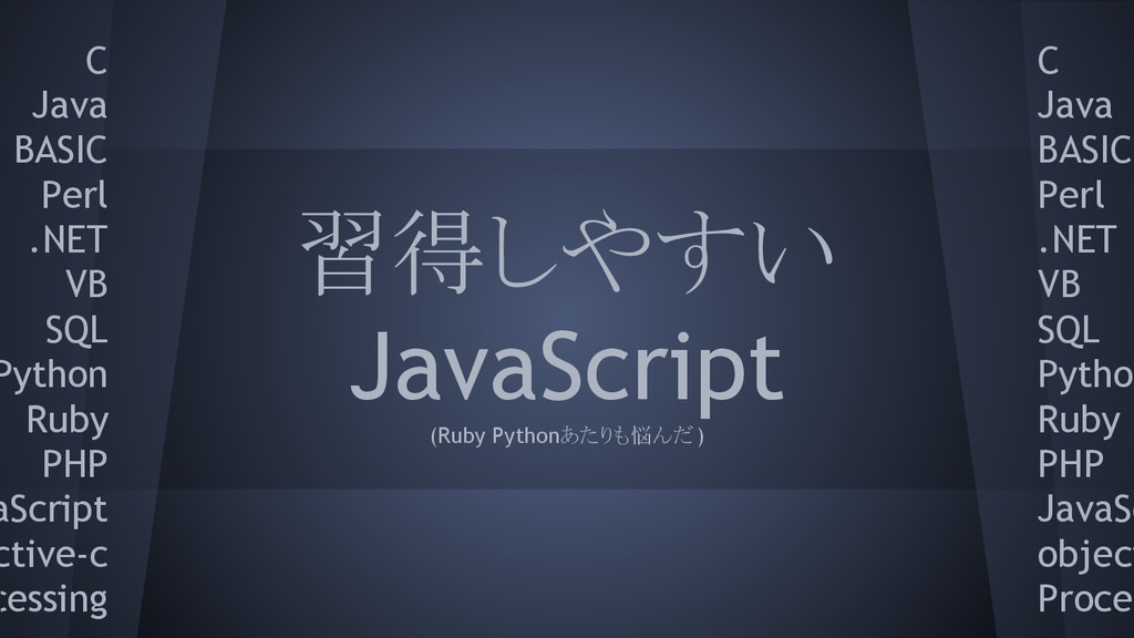 習得しやすい JavaScript (Ruby Pythonあたりも悩んだ) C Java BASIC Perl .NET VB