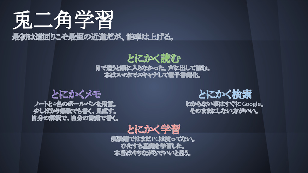 兎二角学習 最初は遠回りこそ最短の近道だが、能率は上げる。 とにかく読む 目で追うと頭に入らなかった。声に出して読む。 本はスマホでスキャナして電子書籍化。 とにかくメモ ノートと4色のボールペンを用意。 少しばかり無駄でも書く、見直す。 自分の解釈で、自分の言葉で書く。 とにかく検索