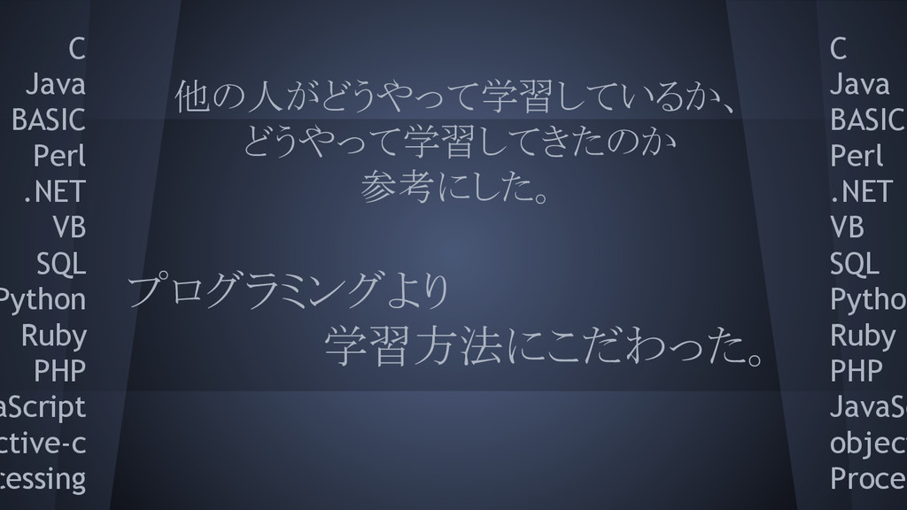 他の人がどうやって学習しているか、 どうやって学習してきたのか 参考にした。 プログラミングより 学習方法にこだわった。 C Java BASIC Perl .NET
