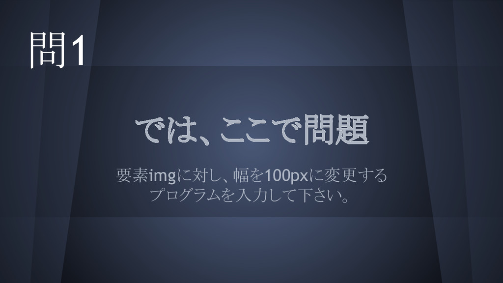 では、ここで問題 要素imgに対し、幅を100pxに変更する プログラムを入力して下さい。 問1