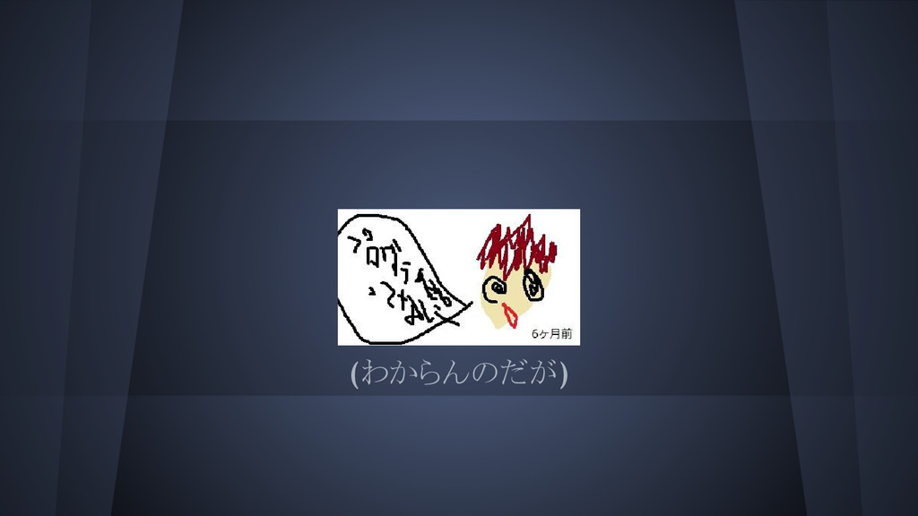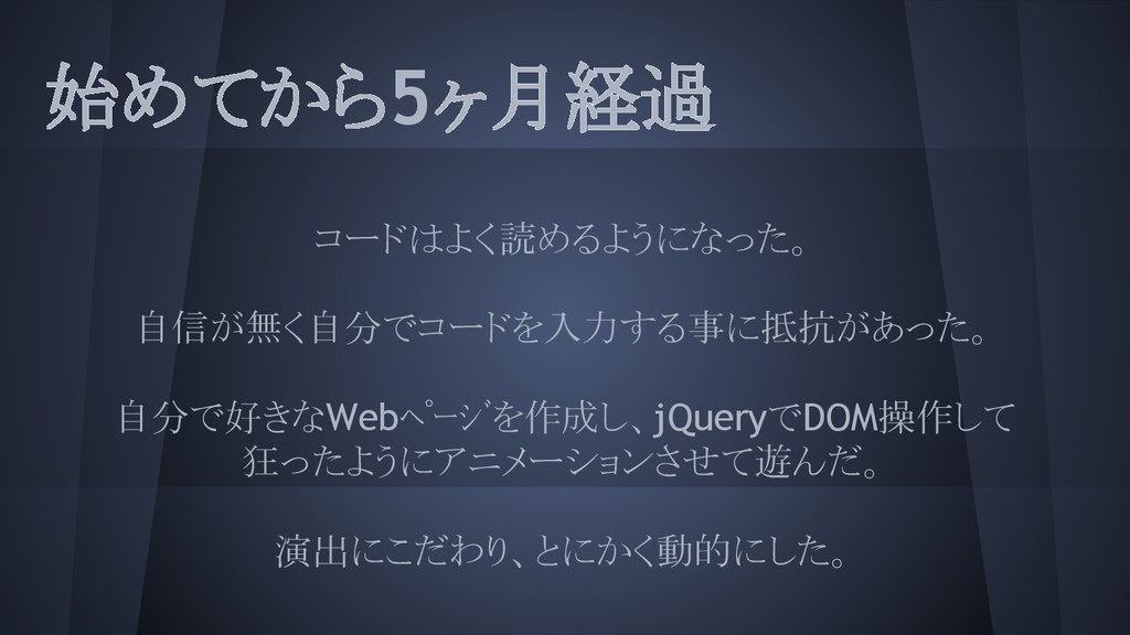 始めてから5ヶ月経過 コードはよく読めるようになった。 自信が無く自分でコードを入力する事に抵抗があった。 自分で好きなWebページを作成し、jQueryでDOM操作して 狂ったようにアニメーションさせて遊んだ。 演出にこだわり、とにかく動的にした。