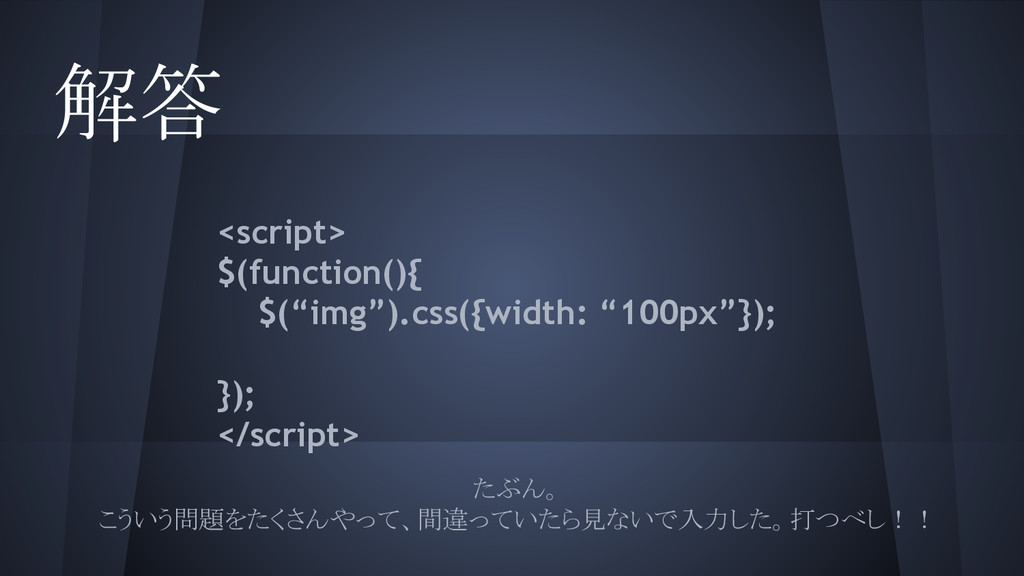 <script> $(function(){ $(“img”).css({width: “100px”}); }); </script> たぶん。 こういう問題をたくさんやって、間違っていたら見ないで入力した。打つべし!! 解答