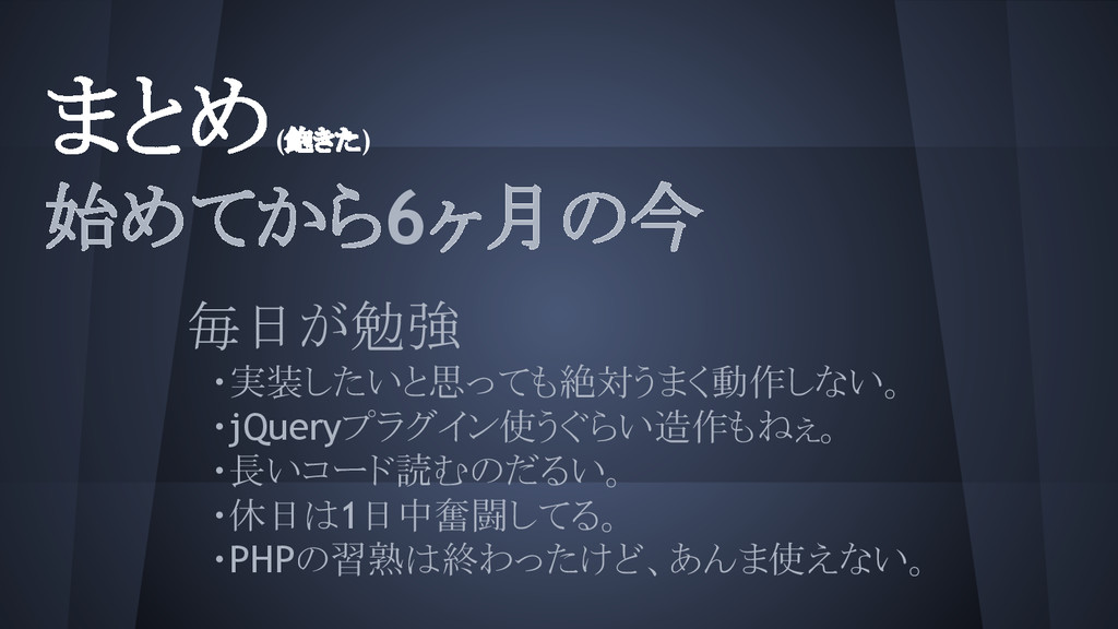 まとめ(飽きた) 始めてから6ヶ月の今 毎日が勉強 ・実装したいと思っても絶対うまく動作しない。 ・jQueryプラグイン使うぐらい造作もねぇ。 ・長いコード読むのだるい。 ・休日は1日中奮闘してる。 ・PHPの習熟は終わったけど、あんま使えない。