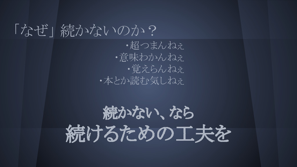 続かない、なら 続けるための工夫を 「なぜ」 続かないのか? ・超つまんねぇ ・意味わかんねぇ ・覚えらんねぇ ・本とか読む気しねぇ