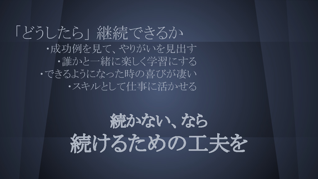 続かない、なら 続けるための工夫を 「どうしたら」 継続できるか ・成功例を見て、やりがいを見出す ・誰かと一緒に楽しく学習にする ・できるようになった時の喜びが凄い ・スキルとして仕事に活かせる