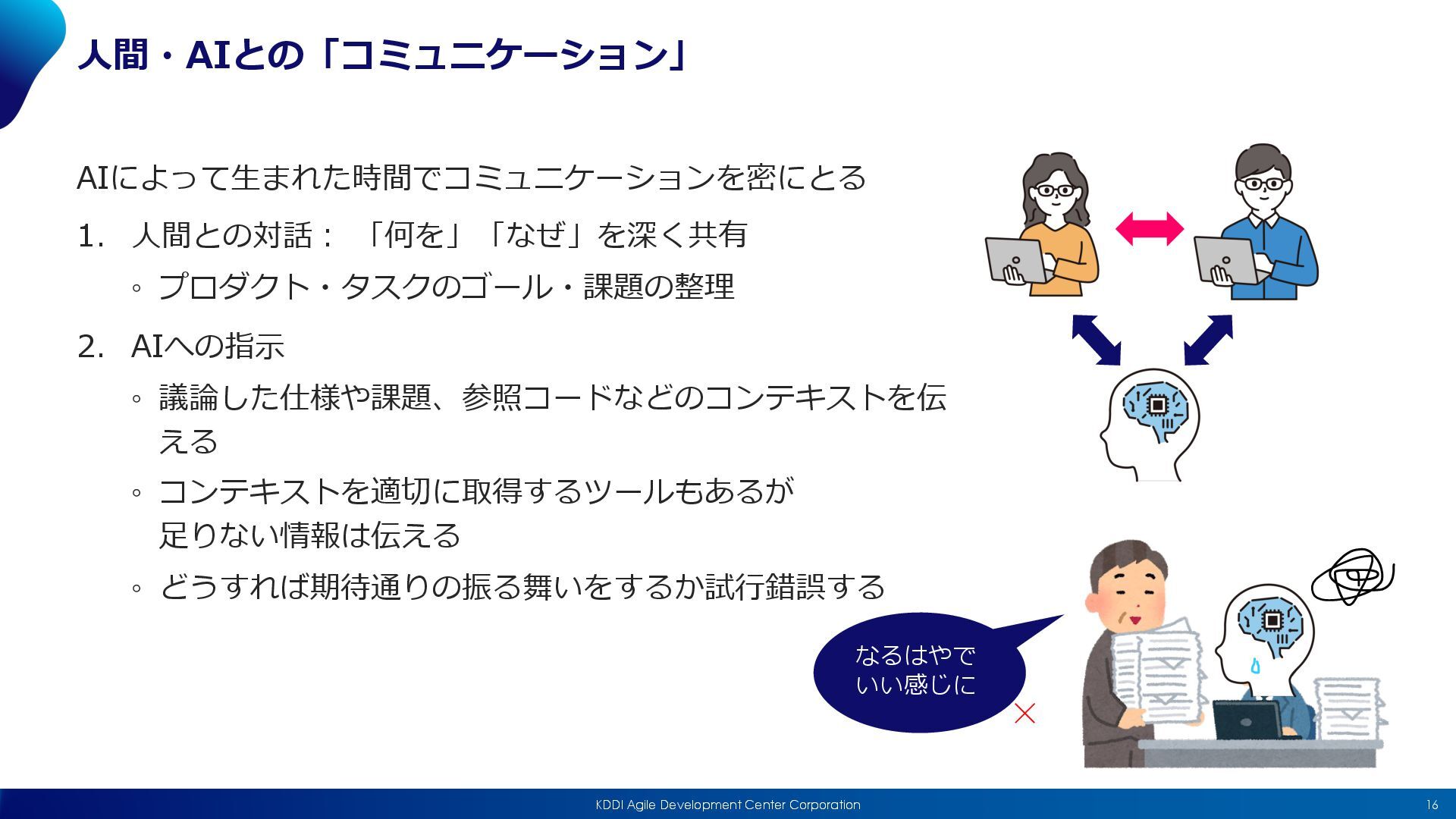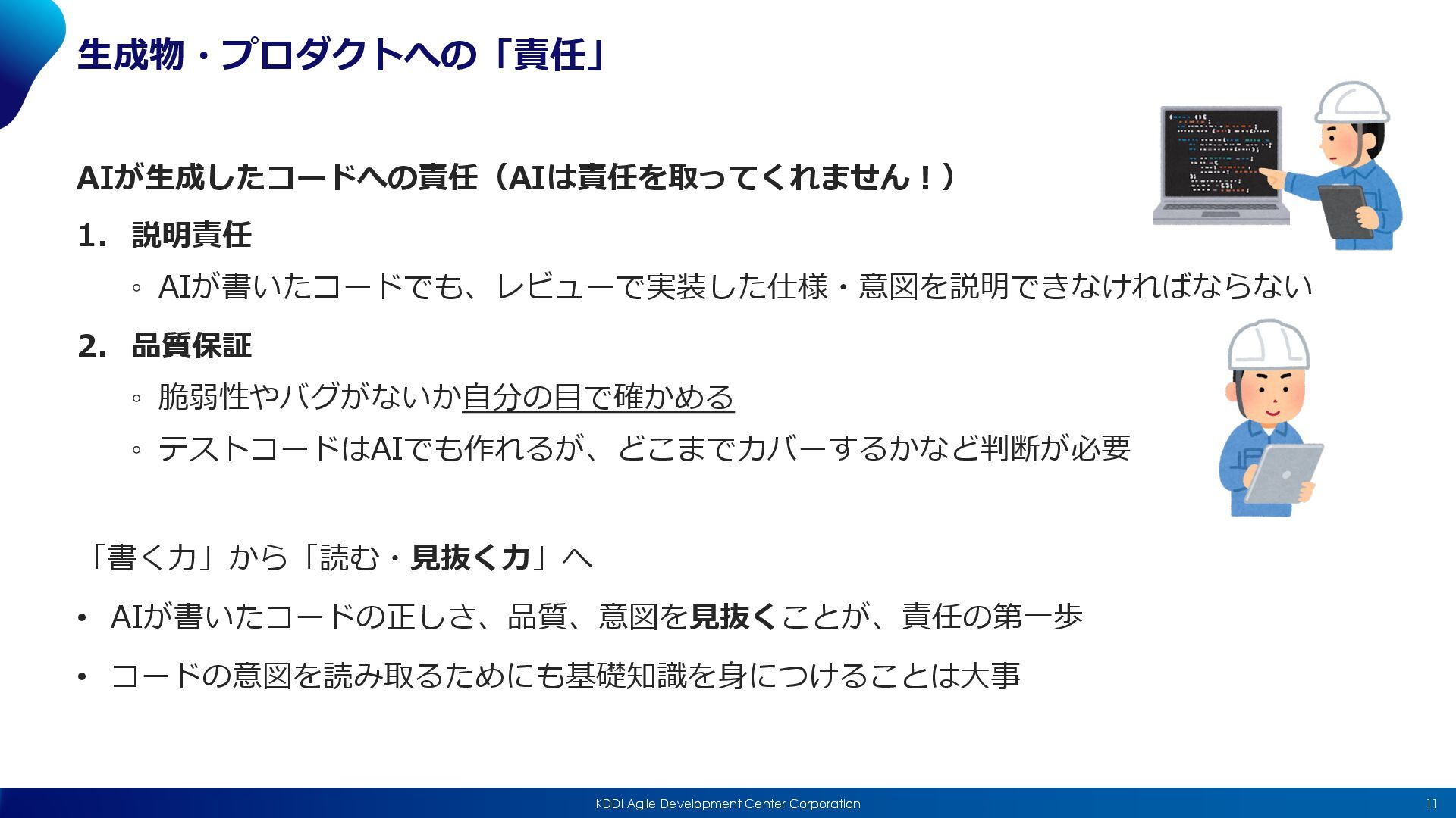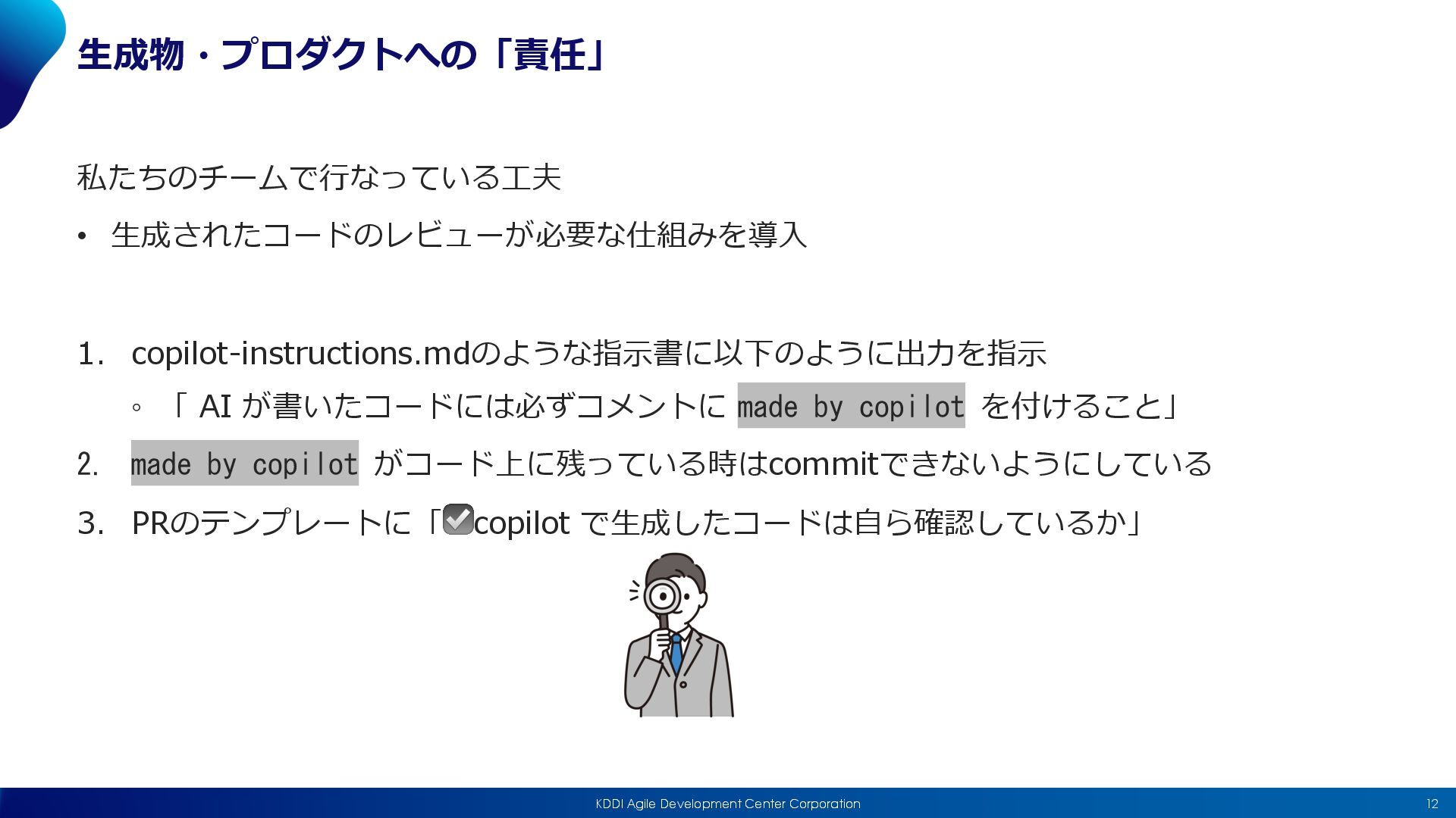 1. copilot-instructions.mdのような指⽰書に以下のように出⼒を指⽰ ◦ 「 AI が書いたコードには必ずコメントに made by copilot を付けること」 2. made by copilot がコード上に残っている時はcommitできないようにしている 3. PRのテンプレートに「☑copilot で⽣成したコードは⾃ら確認しているか」