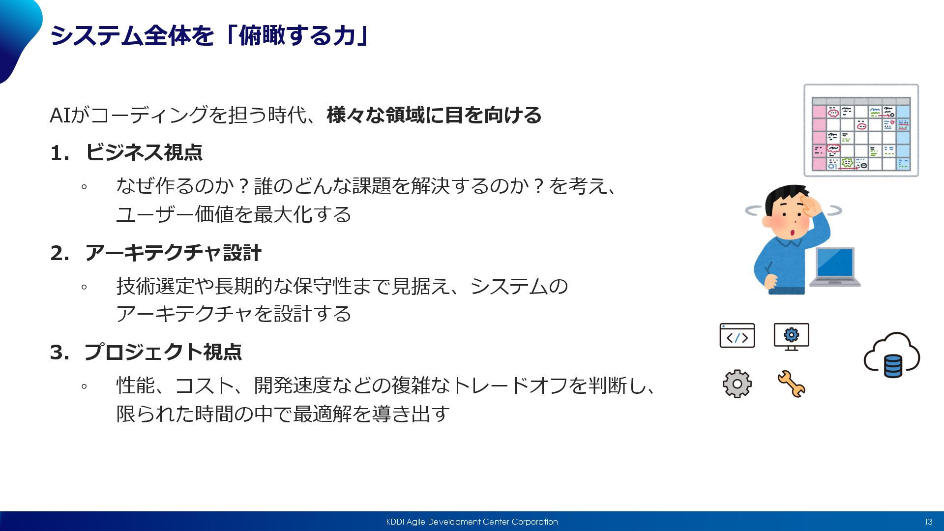 ◦ 使うのは⼈間、⼈間にとって良いものが分かるのは⼈間のはず 1. デザインなどのUI ◦ ⾊味・⼤きさ・形・配置が気になる ◦ 画⾯が⼀瞬ちらつくのが気になる 2. 使⽤感などのUX ◦ フローが多くてイライラ ◦ A → B → C じゃなくて A → C → B が納得感ある, A + C → B でも良いなど • ⽣成AIが⼈間の感覚を模倣して提案する未来はあるのか…