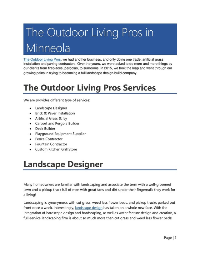 The Outdoor Living Pros, we had another business, and only doing one trade: artificial grass installation and paving contractors. Over the years, we were asked to do more and more things by our clients—from fireplaces, pergolas, to sunrooms. In 2015, we took the leap and went through our growing pains in trying to becoming a full landscape design-build company. We have learned that in order to be completely successful at anything, you need to have within it people who are truly professionals and passionate at what they do.