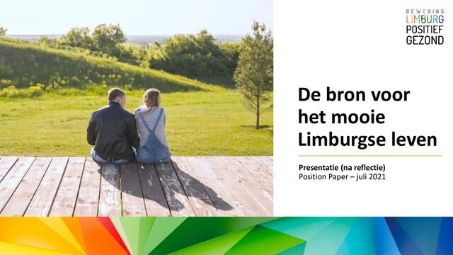 plek in Limburg ingenomen. Op allerlei plekken en niveaus is beweging ontstaan waar PG bijdraagt aan een mooi leven. Toepassing van PG in het zorg-, welzijns- en overheidsdomein komt het meest naar voren. De aanpak heeft zich in de afgelopen jaren dan ook vooral daarop gevormd. Er is méér nodig om de grote ambities in Limburg waar te maken. De verzorgingsstaat is in decennia opgebouwd, dus ook de omslag naar meer eigen regie en PG vraagt vasthoudendheid en visie; blijf doen wat goed gaat en breid uit met wat nodig is voor méér impact. SAMENGEVAT Een versterkte inzet op andere (laagdrempelige) toepassingen en domeinen is nodig om meer ‘normale’ (Lim)burgers te bereiken en PG een gedeelde taal te maken. Durf daarbij je positie te houden, want met beperkte tijd/middelen kan niet alles (tegelijk). Onderwijs, werk, sport, cultuur, etc.; daar zijn de meeste Limburgers te vinden, ook als het (meestal) goed met ze gaat. Door meer domeinen te betrekken en domeinoverschrijdend te matchen komt een meer integrale benadering en verbinding tot stand. Weinig (Lim)burgers noch professionals zullen tégen PG zijn. Dat betekent echter niet dat zij (BL)PG of het aanbod al kennen, toepassen of behoefte hebben aan meer kennis. De huidige benadering (aanbod) wordt nog vaak ervaren als abstract en op professionals gericht. Een aanvullende, laagdrempeligere aanpak is daarom nodig. Professionals zijn ook (Lim)burgers, dus zullen door die concretisering ook meer geraakt worden. De Limburgse katalysator van PG De sociale uitdagingen in Limburg zijn groot. De Sociale Agenda Limburg heeft als doel om de zelfredzaamheid en samenredzaamheid van Limburgers in een kwetsbare positie te vergroten en hun participatie in de samenleving te verbeteren. Het gedachtengoed van Positieve Gezondheid is hieraan nauw verbonden en wordt breed omarmd. Die transformatie vraagt een lange adem en het voortzetten van inzet met sterke bestaande en nieuwe partners. LANGE ADEM OM GROTE SOCIALE ACHTERSTANDEN TERUG TE DRINGEN VERBREDEN EN VERBINDEN VOOR (OOK) PREVENTIEVE FUNCTIE NOODZAKELIJKE VERTAALSLAG MAKEN NAAR (LIM)BURGERS