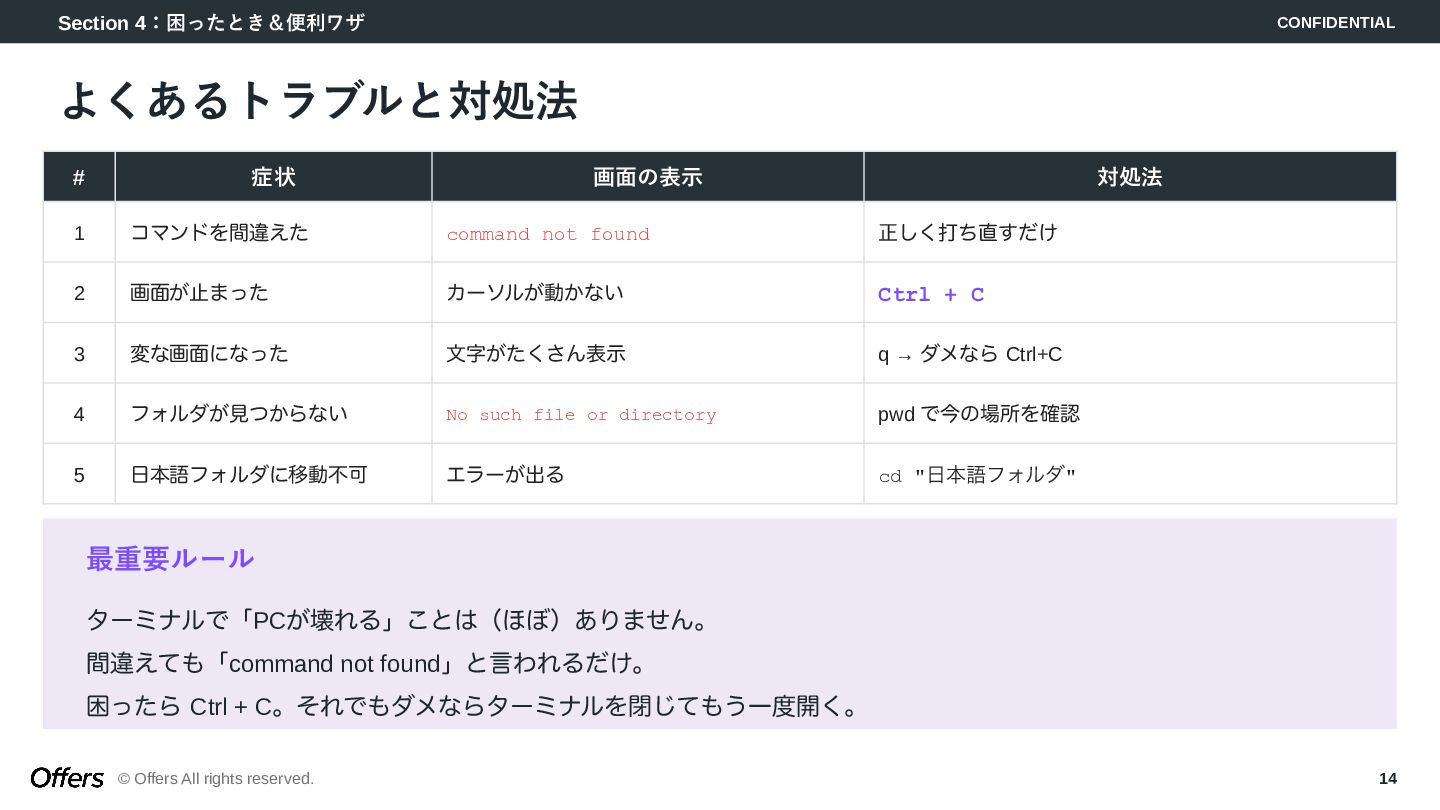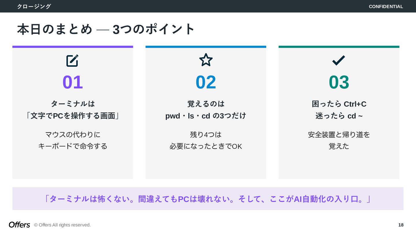 「黒い画面」は怖くない。最低限 3つだけ覚えれば日常は十分。Ctrl+Cで中断、cd~でホームに戻る——この2つの安全装置があれば、PCが壊れることはありません。