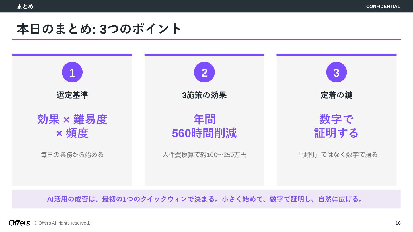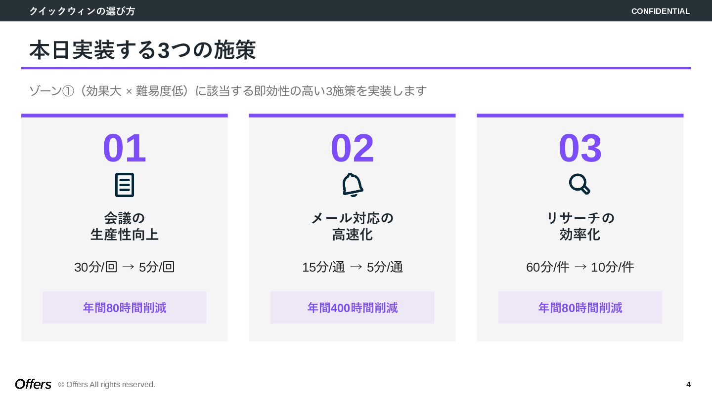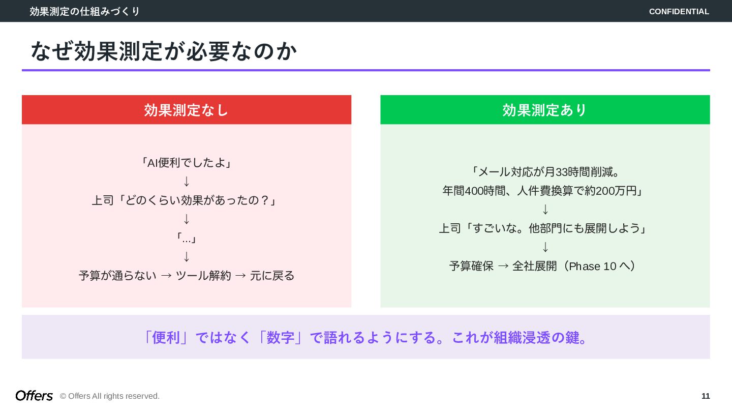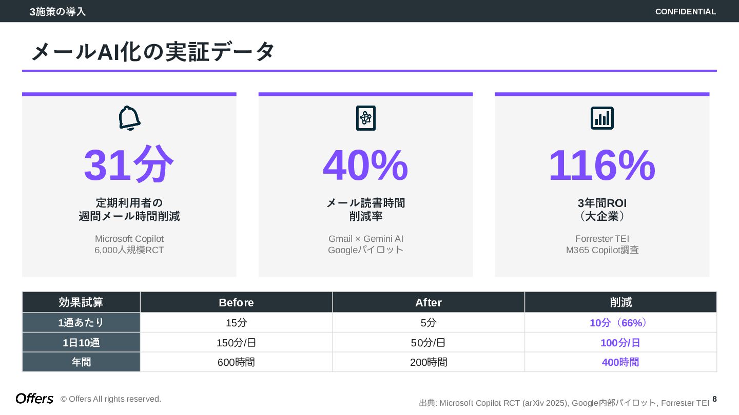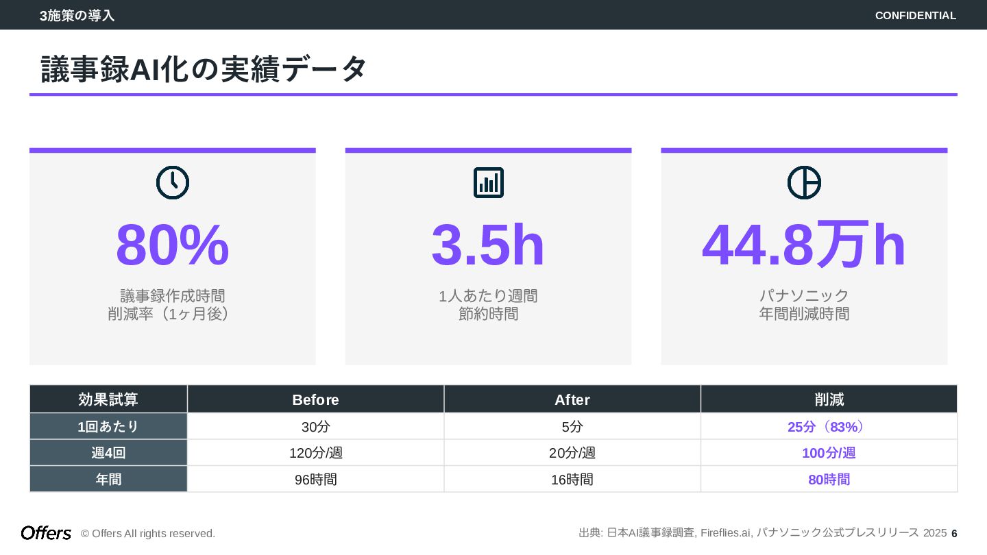 大規模PoCで半年かけるのではなく、即効性のある3施策(議事録作成83%削減・メール対応66%削減・リサーチ83%削減)で定量的な効果を実感します。効果測定フレームワーク付き。