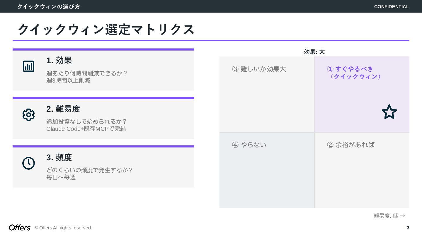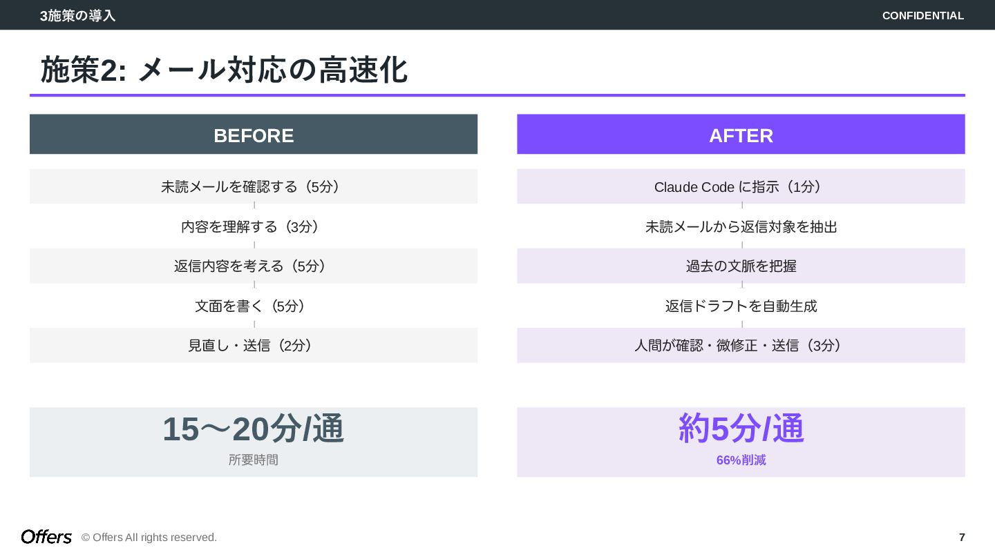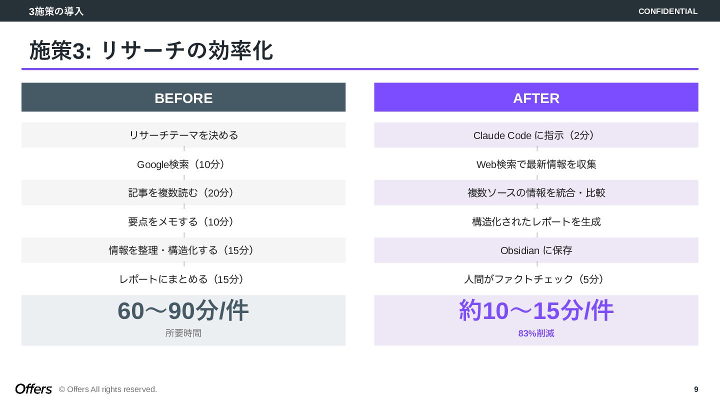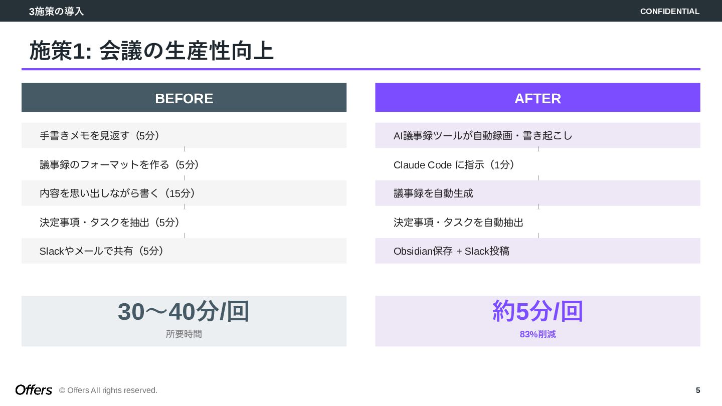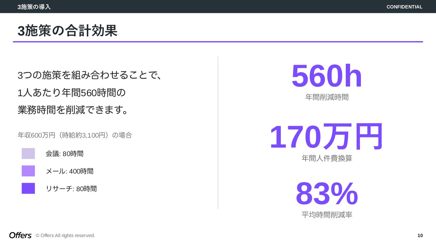 大規模PoCで半年かけるのではなく、即効性のある3施策(議事録作成83%削減・メール対応66%削減・リサーチ83%削減)で定量的な効果を実感します。効果測定フレームワーク付き。