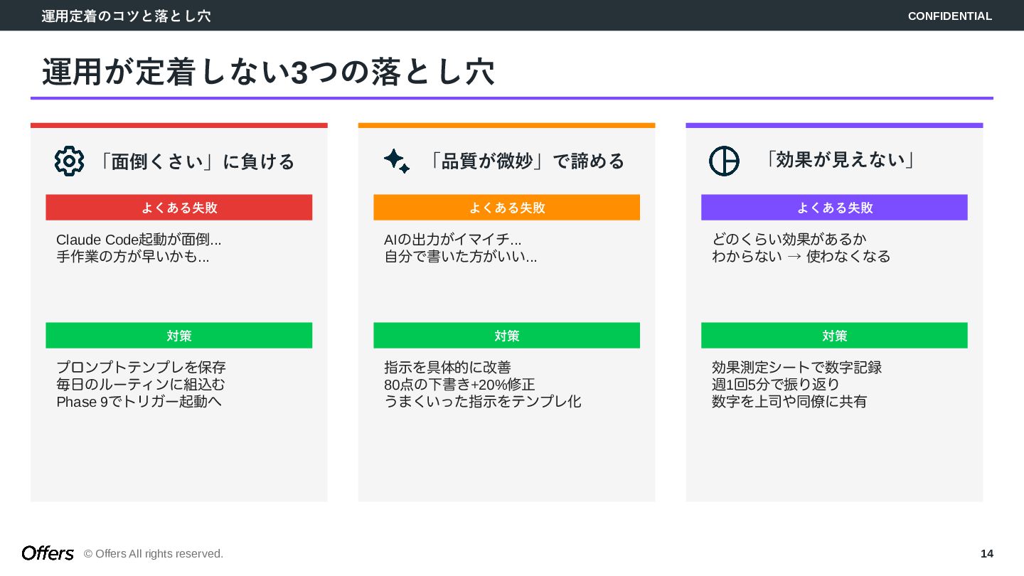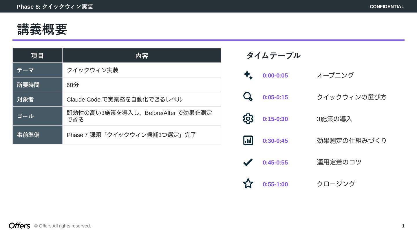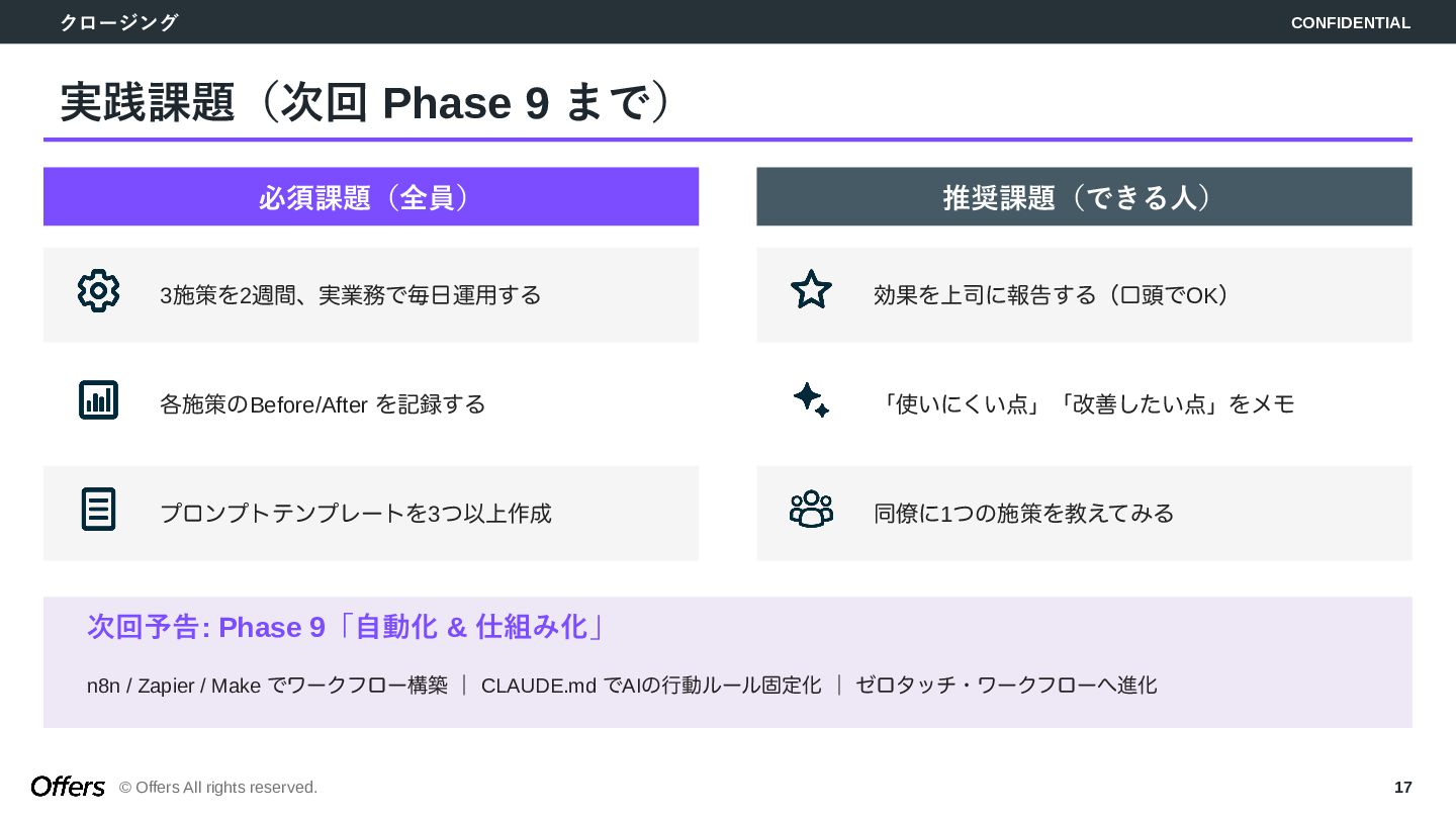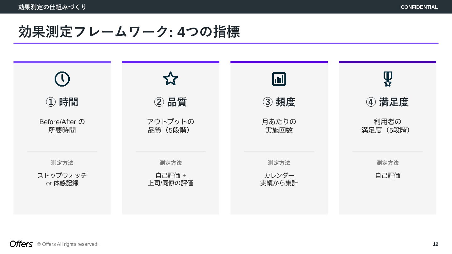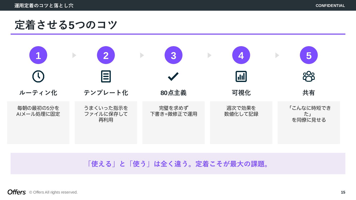 大規模PoCで半年かけるのではなく、即効性のある3施策(議事録作成83%削減・メール対応66%削減・リサーチ83%削減)で定量的な効果を実感します。効果測定フレームワーク付き。