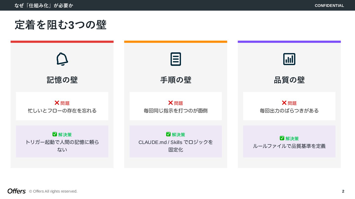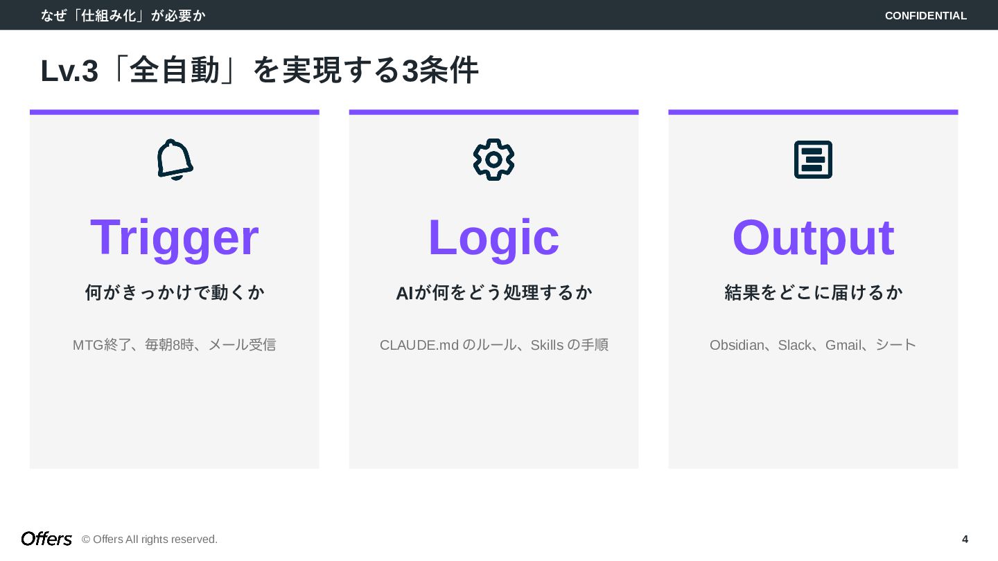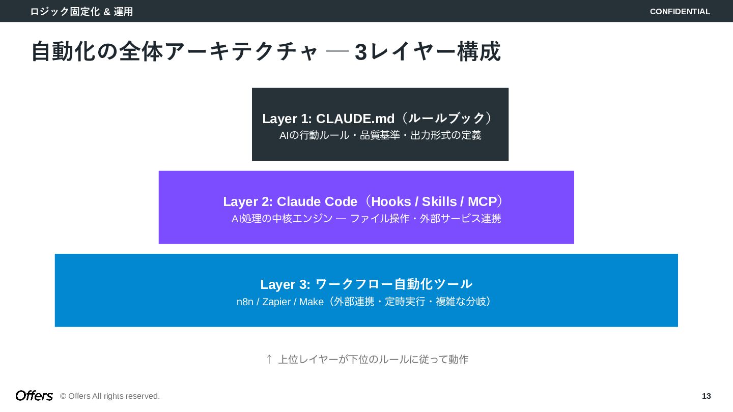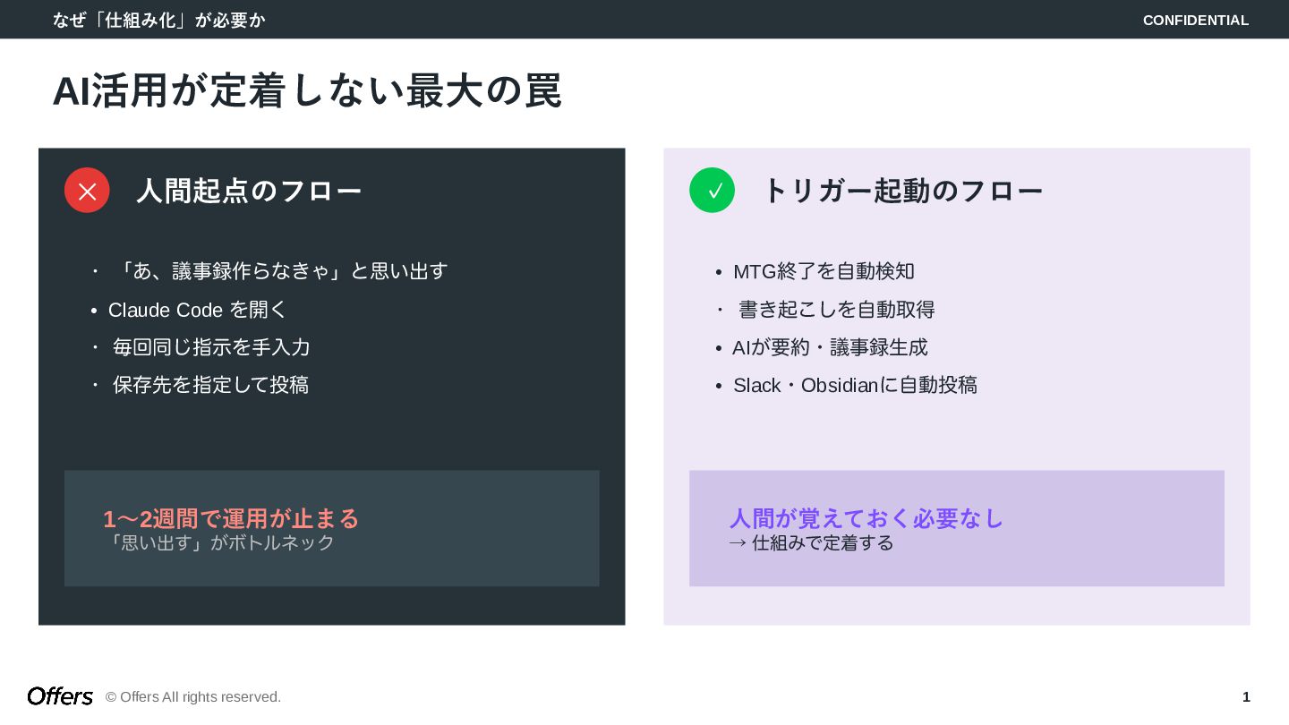 「人間が起点」から「トリガーでAIが自動で動く」へ。CLAUDE.mdでロジックを固定化し、Hooks・Skillsで品質を担保。MTG→議事録→タスク抽出、毎朝業務準備、日報生成の3つのゼロタッチ・ワークフローを構築します。