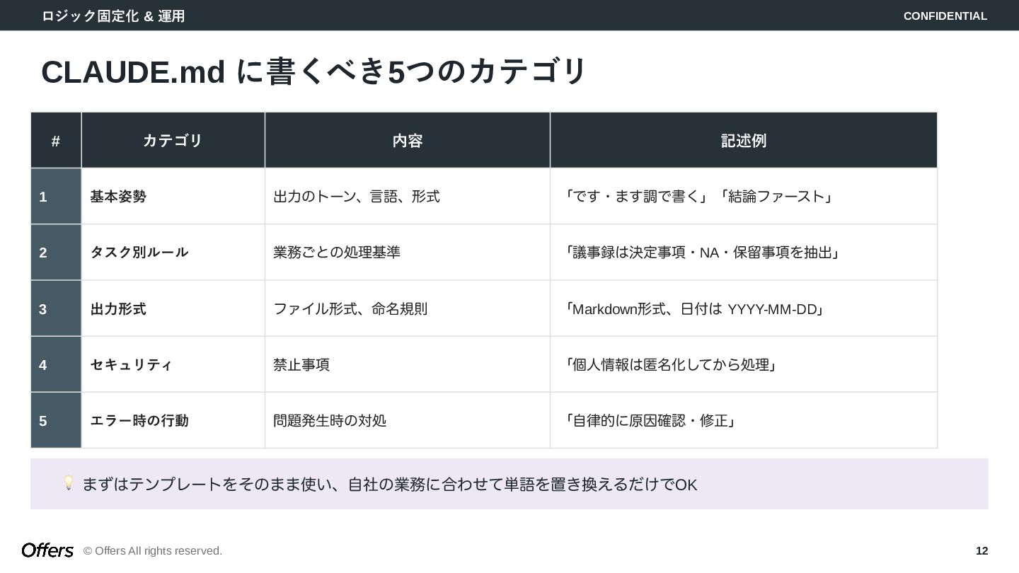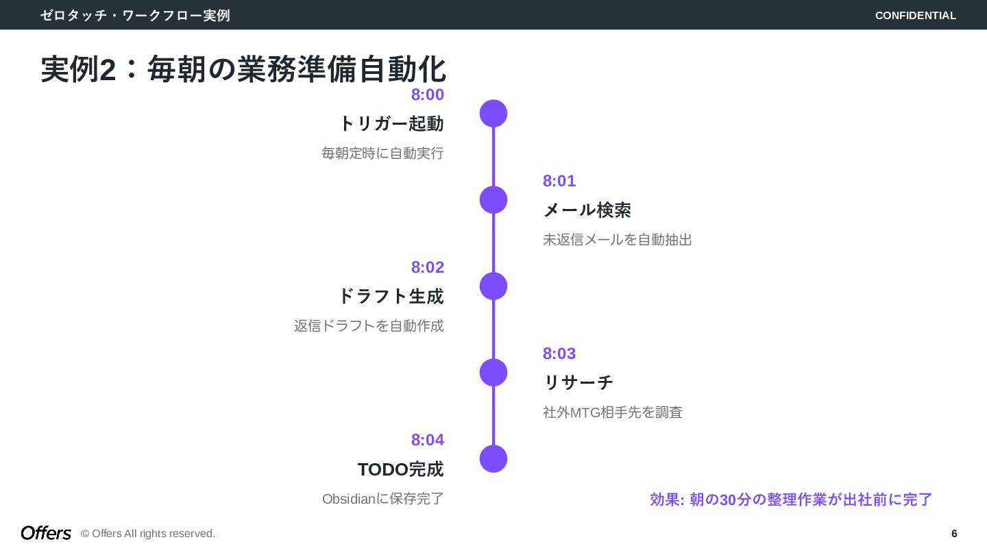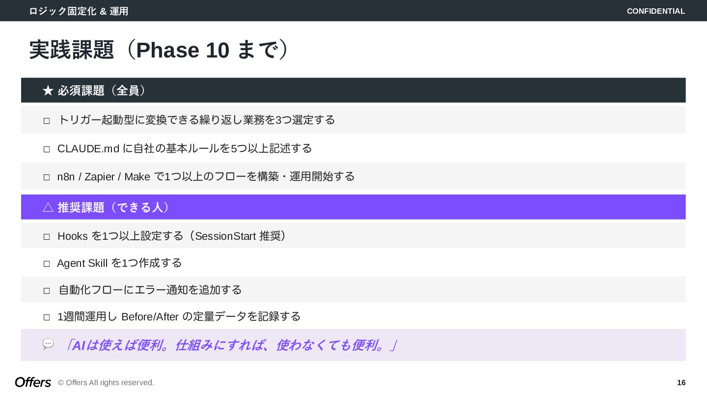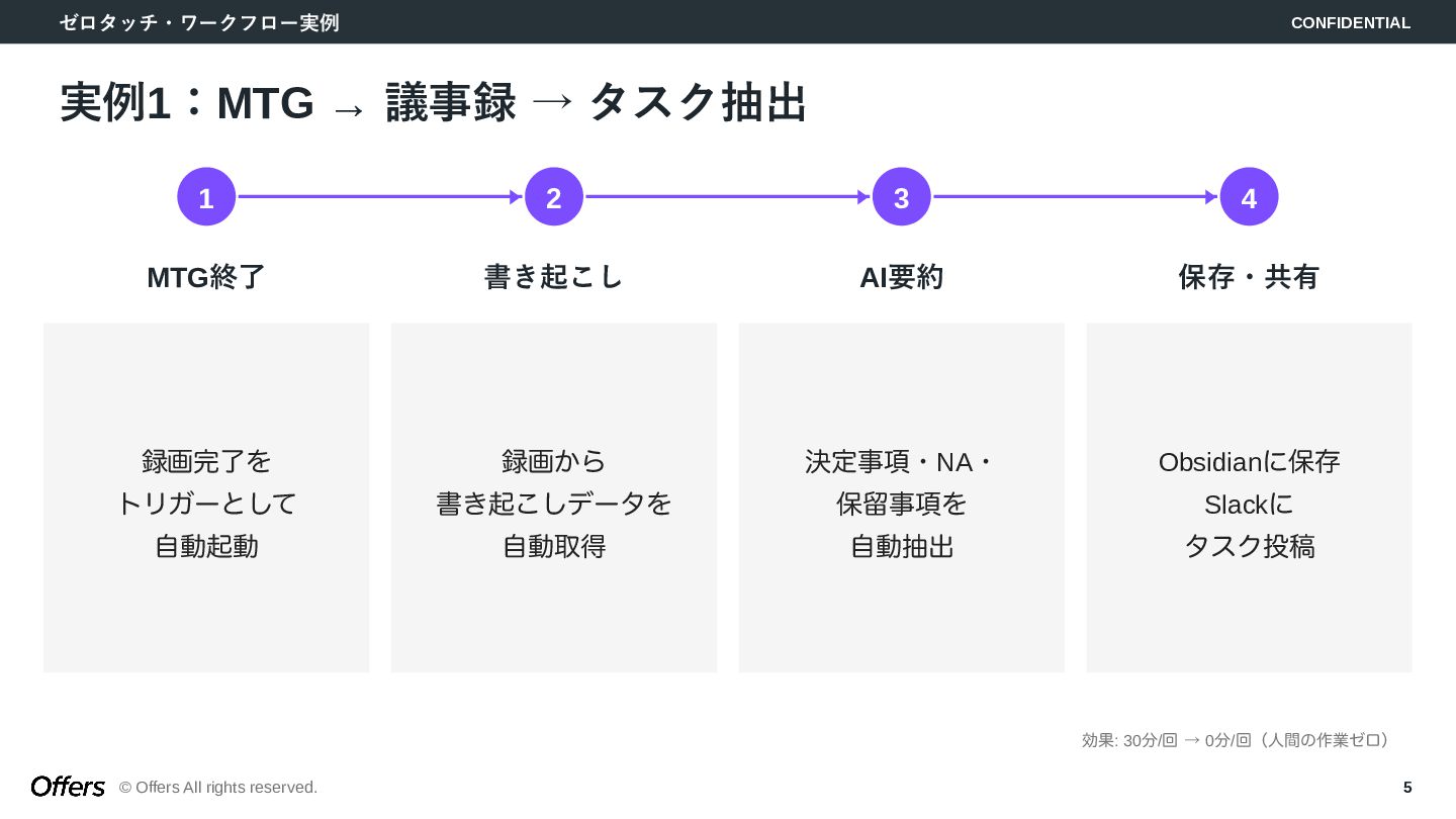 「人間が起点」から「トリガーでAIが自動で動く」へ。CLAUDE.mdでロジックを固定化し、Hooks・Skillsで品質を担保。MTG→議事録→タスク抽出、毎朝業務準備、日報生成の3つのゼロタッチ・ワークフローを構築します。