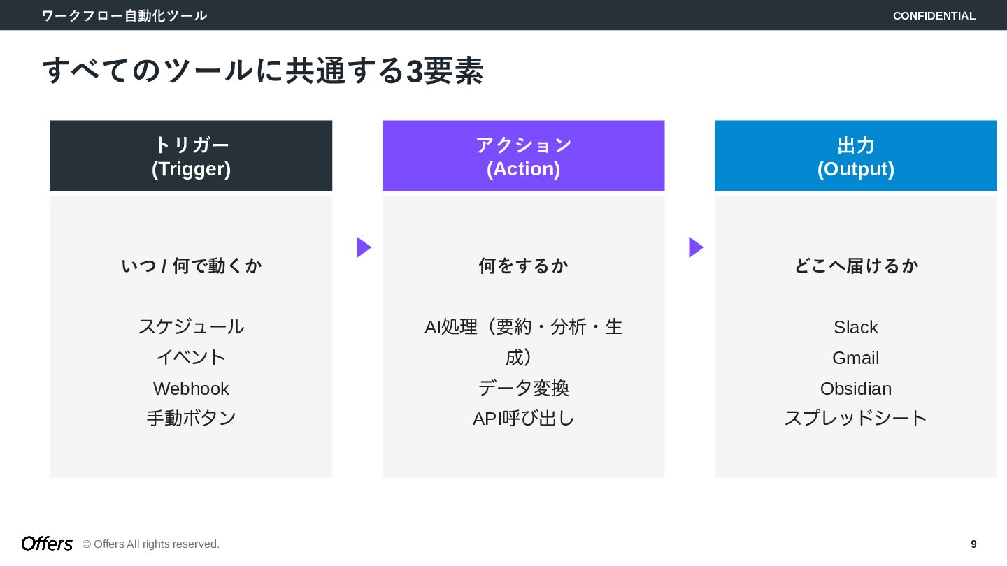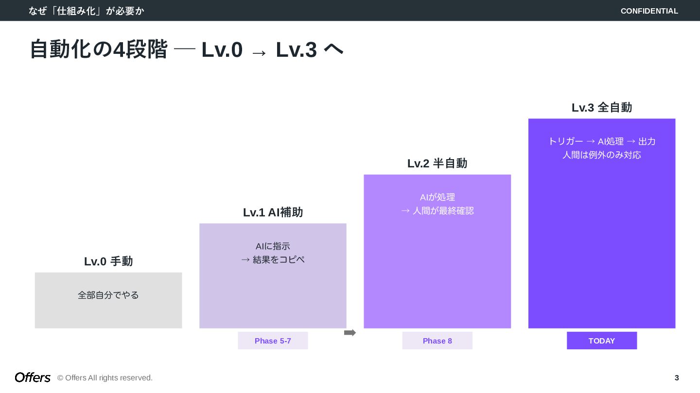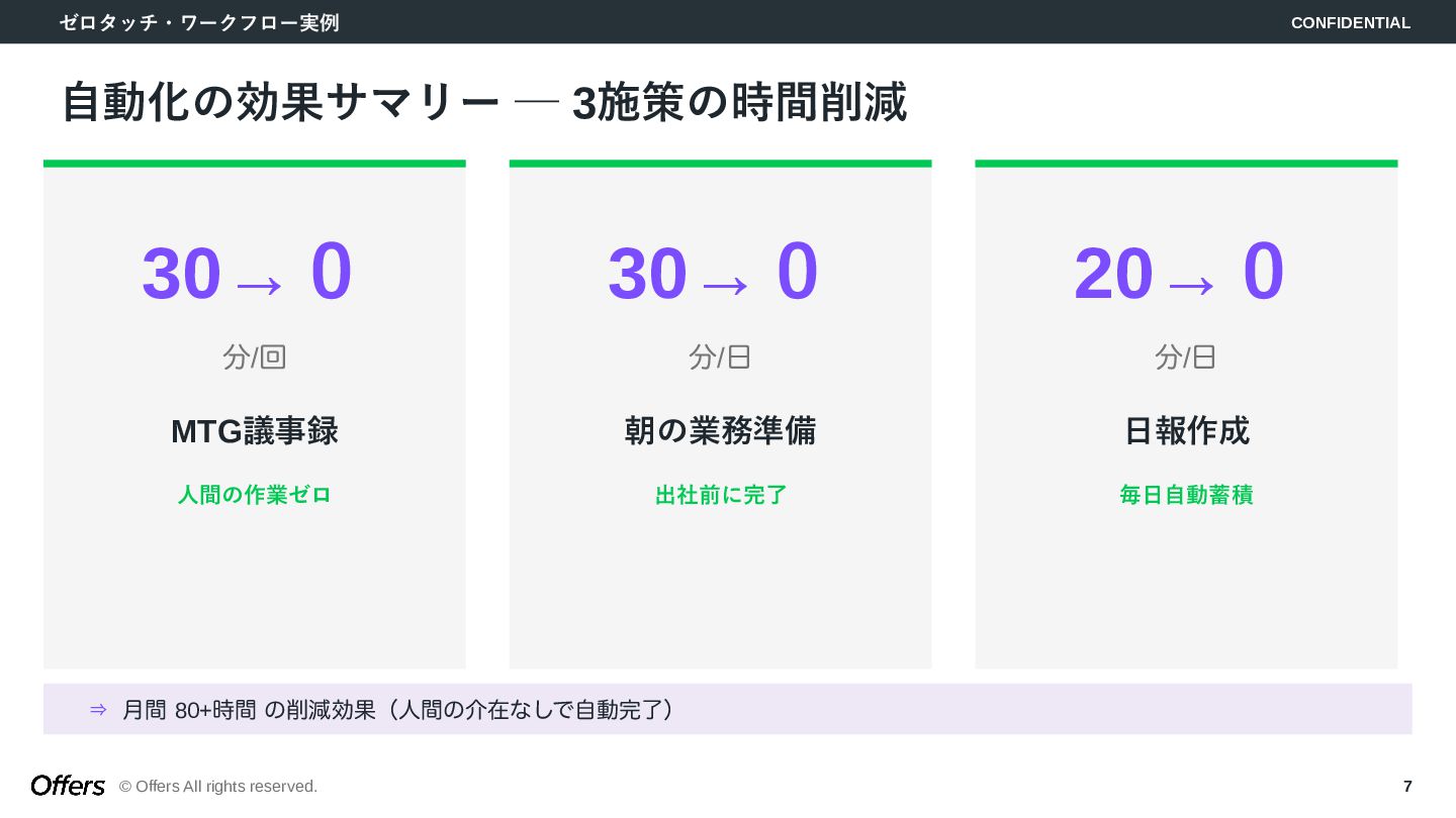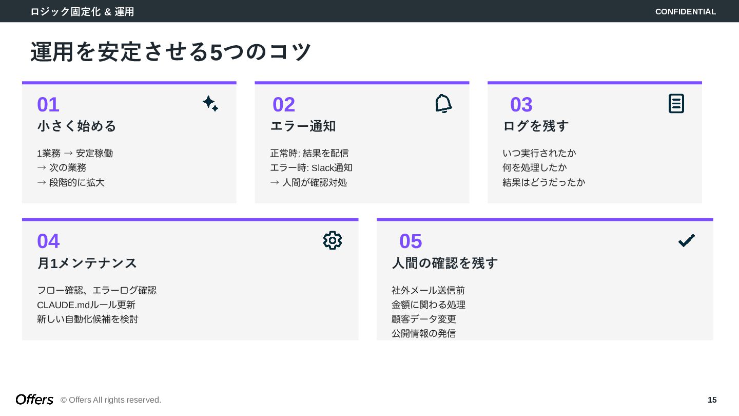 「人間が起点」から「トリガーでAIが自動で動く」へ。CLAUDE.mdでロジックを固定化し、Hooks・Skillsで品質を担保。MTG→議事録→タスク抽出、毎朝業務準備、日報生成の3つのゼロタッチ・ワークフローを構築します。