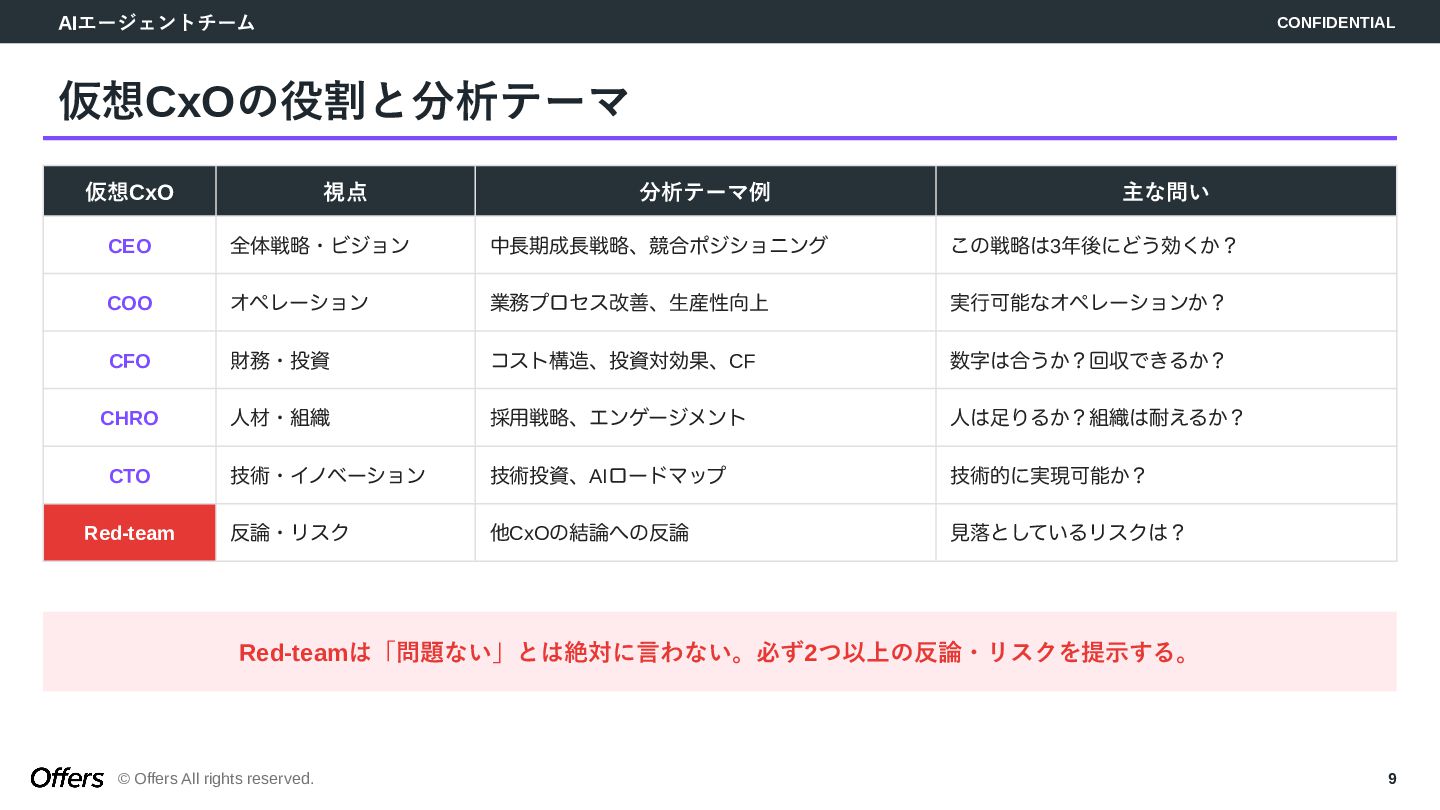 8. AIエージェントチーム CONFIDENTIAL © Offers All rights reserved. 9 仮想CxOの役割と分析テーマ 仮想CxO