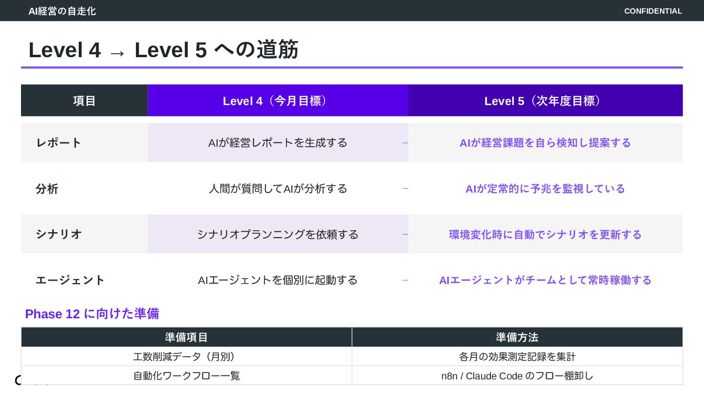 → Level 5 への道筋 項目 Level 4(今月目標) Level 5(次年度目標) レポート AIが経営レポートを生成する → AIが経営課題を自ら検知し提案する 分析 人間が質問してAIが分析する → AIが定常的に予兆を監視している シナリオ シナリオプランニングを依頼する → 環境変化時に自動でシナリオを更新する エージェント AIエージェントを個別に起動する → AIエージェントがチームとして常時稼働する Phase 12 に向けた準備 準備項目 準備方法 工数削減データ(月別) 各月の効果測定記録を集計 自動化ワークフロー一覧 n8n / Claude Code のフロー棚卸し