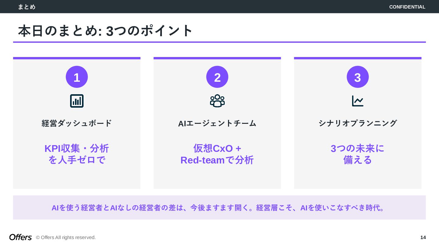 12. まとめ CONFIDENTIAL © Offers All rights reserved. 14 本日のまとめ: 3つのポイント