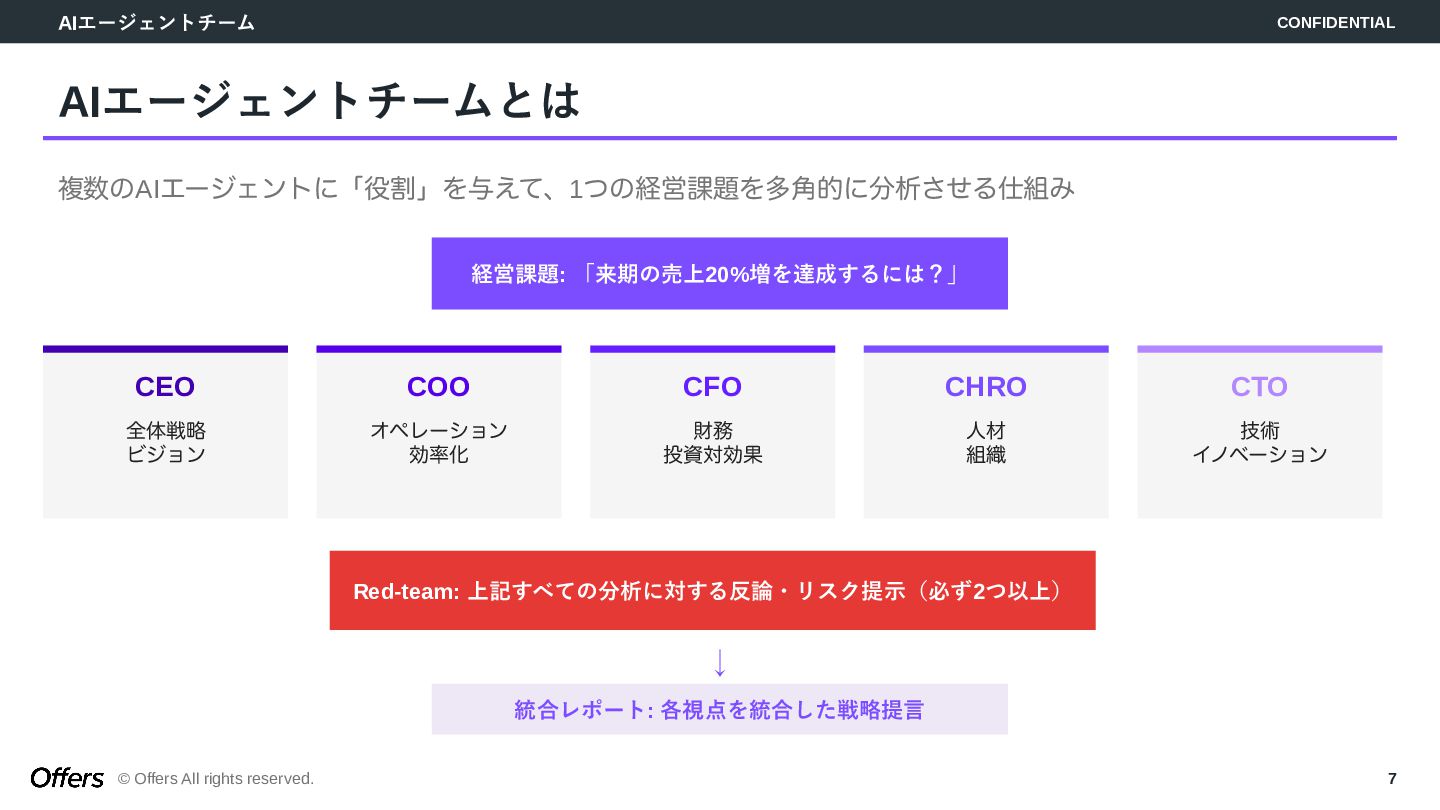 7. AIエージェントチーム CONFIDENTIAL © Offers All rights reserved. 7 AIエージェントチームとは 複数のAIエージェントに「役割」を与えて、1つの経営課題を多角的に分析させる仕組み