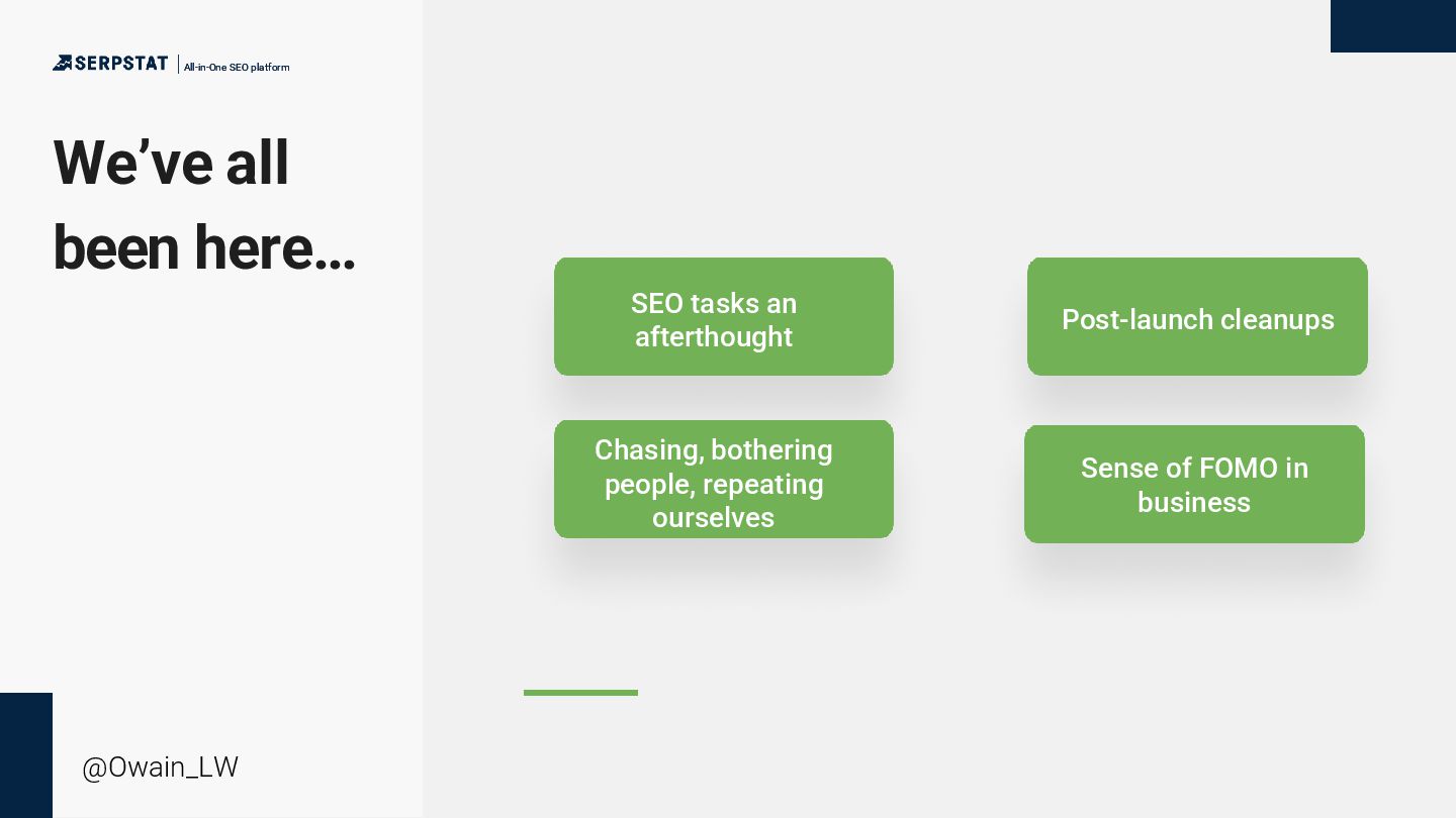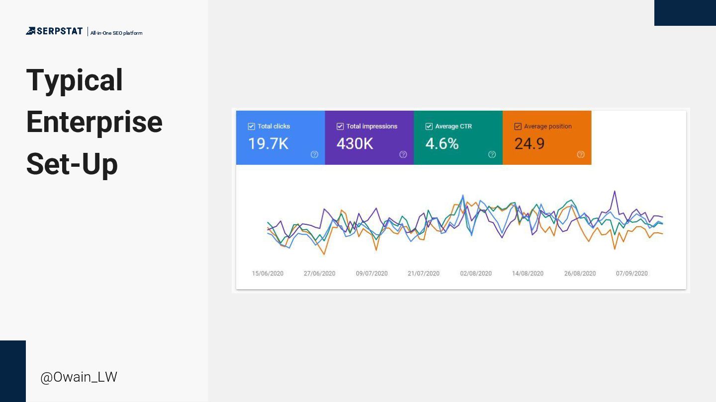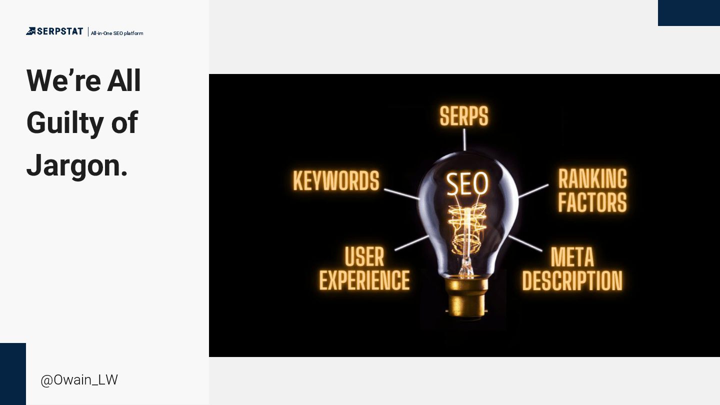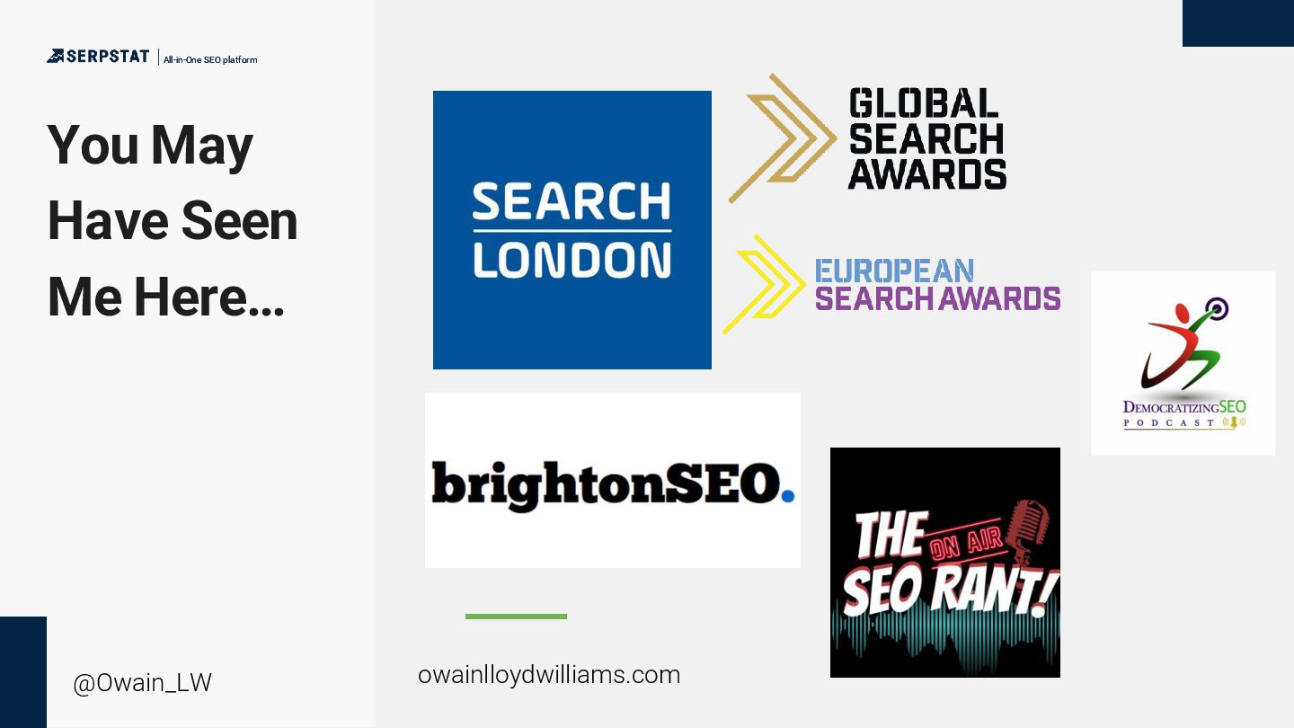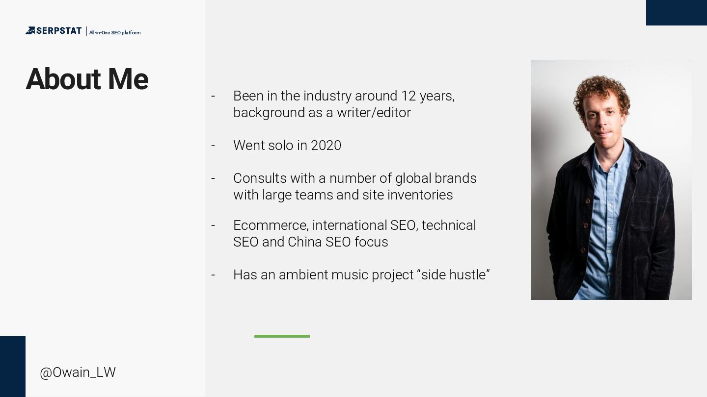 background as a writer/editor - Went solo in 2020 - Consults with a number of global brands with large teams and site inventories - Ecommerce, international SEO, technical SEO and China SEO focus - Has an ambient music project “side hustle” All-in-One SEO platform All-in-One SEO platform @Owain_LW