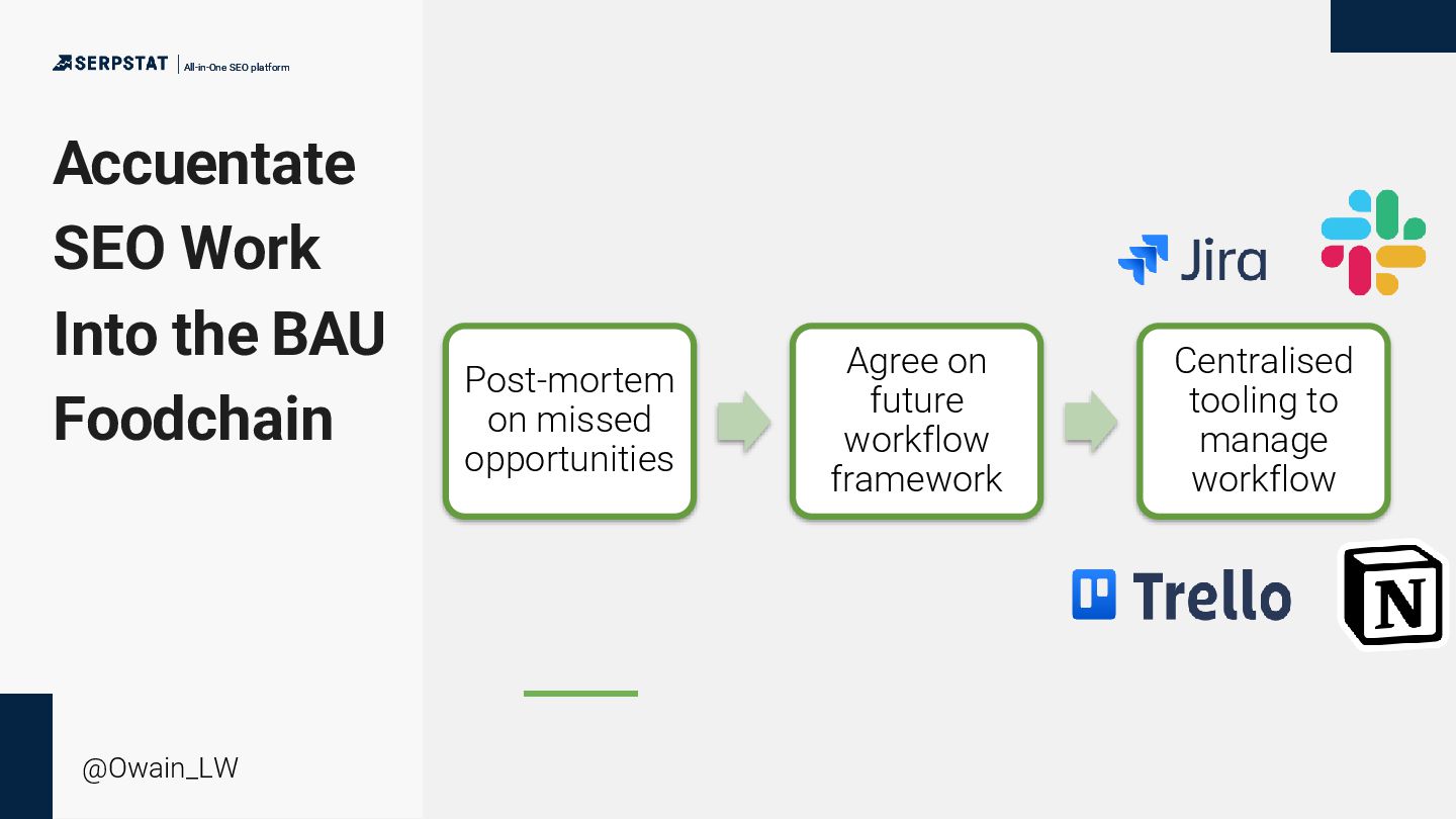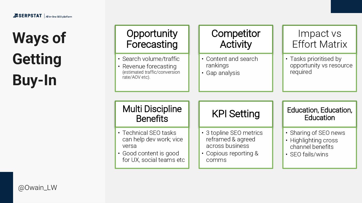 @Owain_LW Opportunity Forecasting • Search volume/traffic • Revenue forecasting (estimated traffic/conversion rate/AOV etc). Competitor Activity • Content and search rankings • Gap analysis Impact vs Effort Matrix • Tasks prioritised by opportunity vs resource required Multi Discipline Benefits • Technical SEO tasks can help dev work; vice versa • Good content is good for UX, social teams etc KPI Setting • 3 topline SEO metrics reframed & agreed across business • Copious reporting & comms Education, Education, Education • Sharing of SEO news • Highlighting cross channel benefits • SEO fails/wins