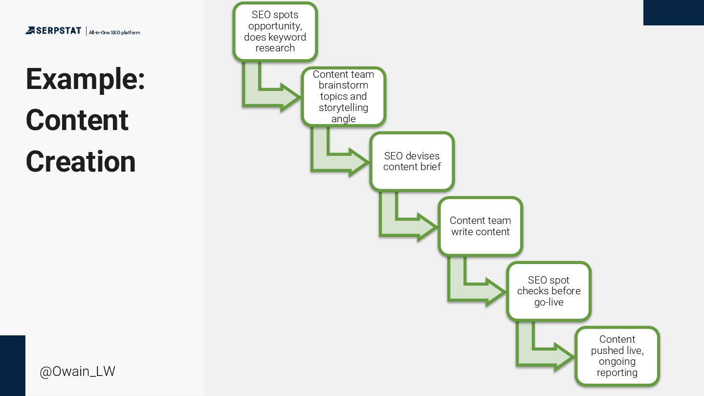 and storytelling angle SEO devises content brief Content team write content SEO spot checks before go-live Content pushed live, ongoing reporting Example: Content Creation All-in-One SEO platform All-in-One SEO platform @Owain_LW