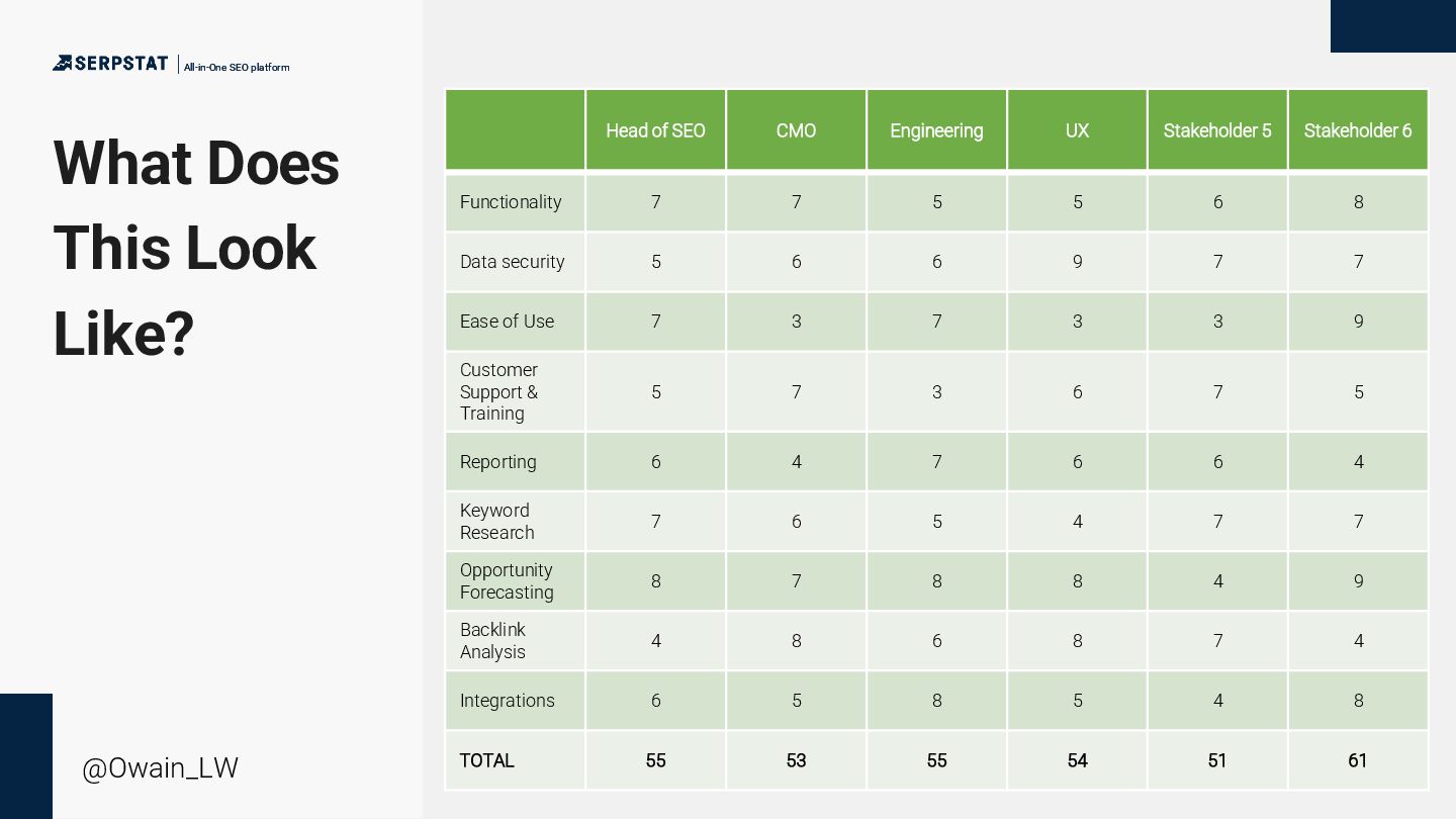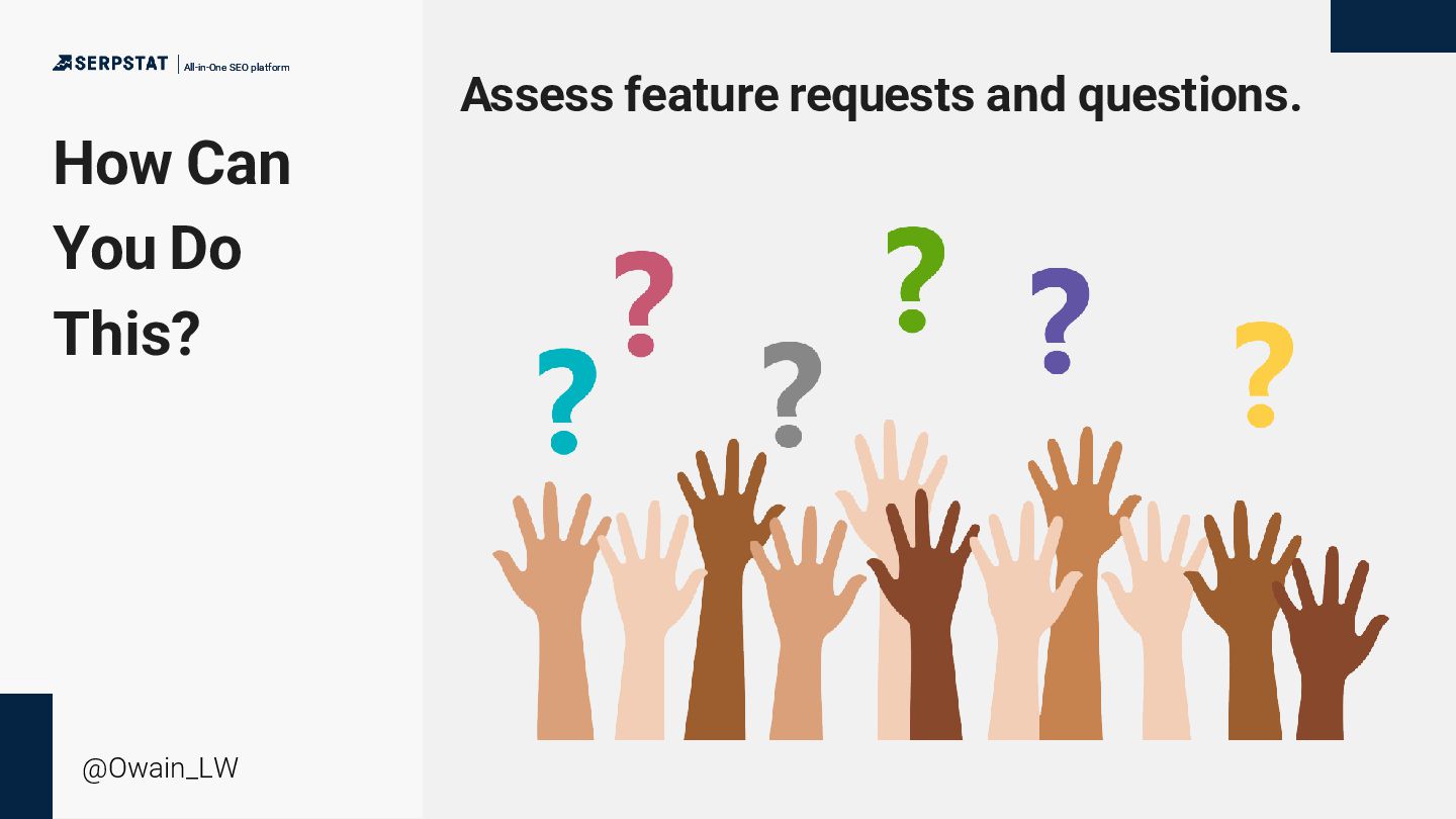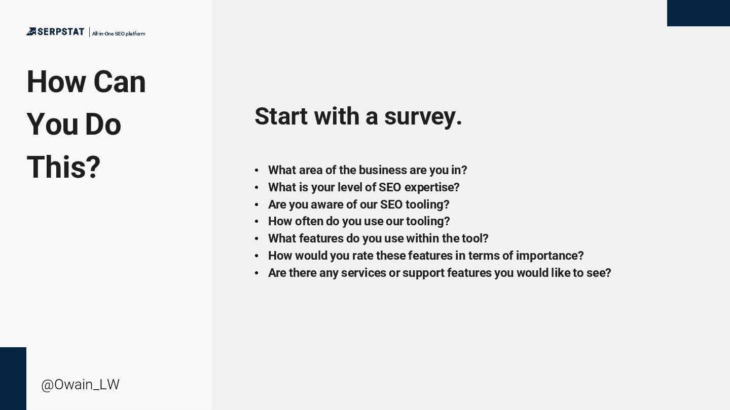 platform @Owain_LW Start with a survey. • What area of the business are you in? • What is your level of SEO expertise? • Are you aware of our SEO tooling? • How often do you use our tooling? • What features do you use within the tool? • How would you rate these features in terms of importance? • Are there any services or support features you would like to see?