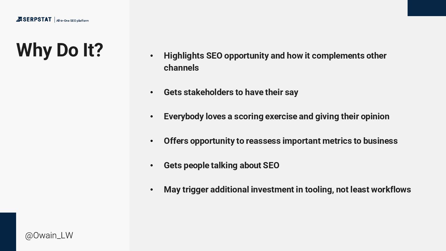• Highlights SEO opportunity and how it complements other channels • Gets stakeholders to have their say • Everybody loves a scoring exercise and giving their opinion • Offers opportunity to reassess important metrics to business • Gets people talking about SEO • May trigger additional investment in tooling, not least workflows