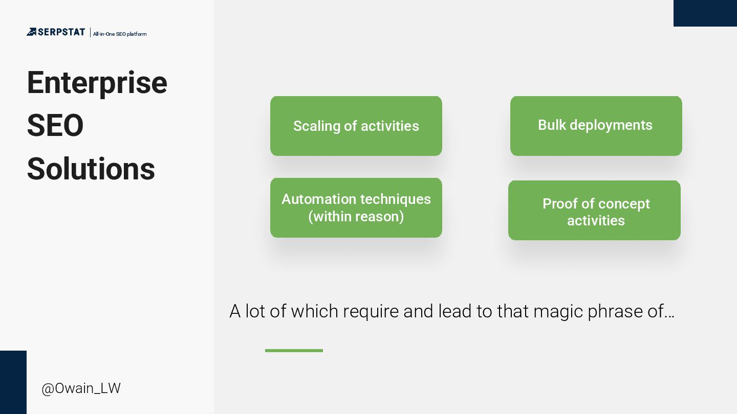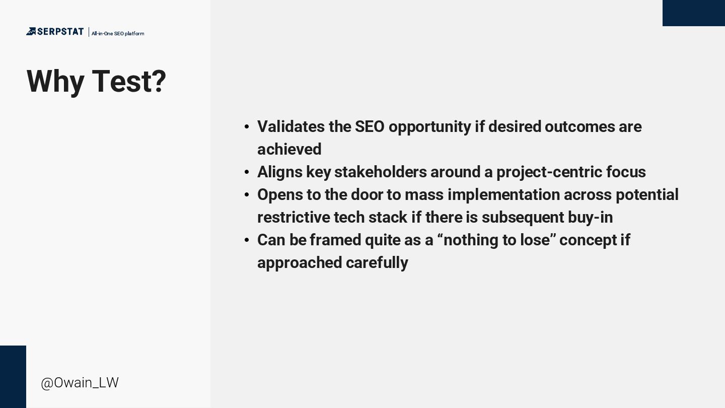 Validates the SEO opportunity if desired outcomes are achieved • Aligns key stakeholders around a project-centric focus • Opens to the door to mass implementation across potential restrictive tech stack if there is subsequent buy-in • Can be framed quite as a “nothing to lose” concept if approached carefully