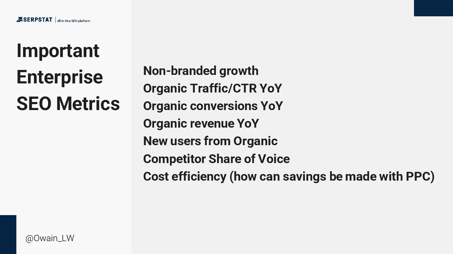 @Owain_LW Non-branded growth Organic Traffic/CTR YoY Organic conversions YoY Organic revenue YoY New users from Organic Competitor Share of Voice Cost efficiency (how can savings be made with PPC)