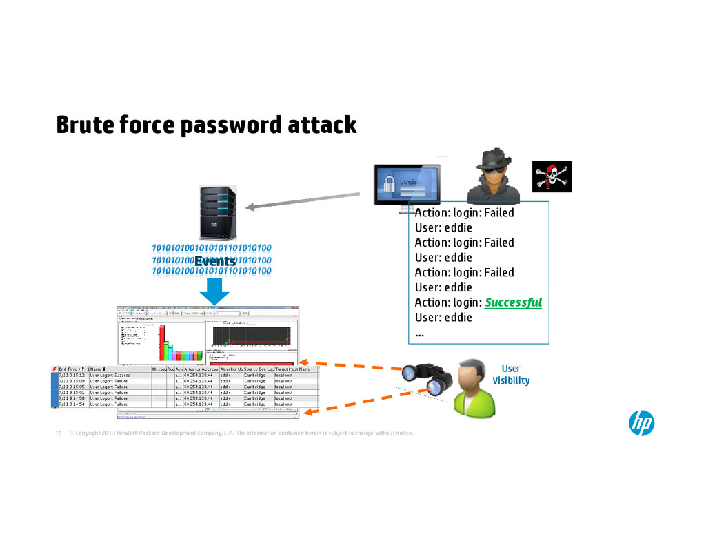 Action: login User: eddie Action: login User: eddie Events © Copyright 2013 Hewlett-Packard Development Company, L.P. The information contained herein is subject to change without notice. 16 User: eddie Login time: 1/1/13, 10:00pm Place: Sunnyvale, CA, USA User: eddie Login time: 1/1/13, 10:05pm Place: Shanghai, China