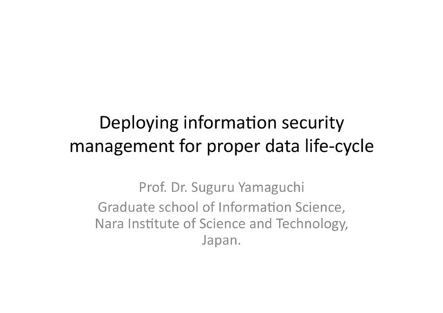 data is a key. – Of course, system protec/on is important, and data transferred over home network is the subject of security management of home networks. – Data is shared and used for management. • Various system involved – Many non PC device – Various protocol standardiza/on • Echonet for HEMS (IS)) • IoT & M2M (BBF etc.) • ITU-‐T, ISO/IEC, etc. • Security func/ons are vital, but s/ll in forest…