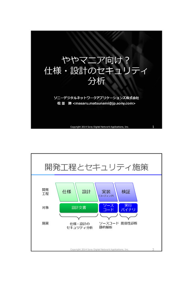 資産, 資産の操作)につ いて、できるべき?できちゃだめ?を検討 ステークホルダ(開発者など)に 「この要件で合っているか?」と確認・調整 資産 セキュリティ要件 ◦◦情報 ├◦◦X情報 ├◦◦Y情報 └◦◦Z情報 【第三者】は【◦◦情報】を【参照∨作成∨変更∨削除】【できない】 【患者】は【自分の◦◦情報】を【参照∨作成∨変更∨削除】【できる】 【患者】は【他人の◦◦情報】を【参照∨作成∨変更∨削除】【できない】 【薬剤師】は【お薬手帳カードが提供されたとき】【◦◦情報】を【参照】【できる】 【薬剤師】は【お薬手帳カードが提供されないとき】【◦◦情報】を【参照】【できない】 【薬剤師】は【◦◦情報】を【作成∨変更∨削除】【できない】 【ソニー】は【◦◦情報】を【参照∨作成∨変更∨削除】【できる】 △△情報 【第三者】は【△△情報】を【参照∨作成∨変更∨削除】【できない】 【患者】は【自分の△△情報】を【参照∨作成∨変更∨削除】【できる】 【患者】は【他人の△△情報】を【参照∨作成∨変更∨削除】【できない】 【薬剤師】は【自局患者の△△情報】を【参照∨作成∨変更∨削除】【できる】 【薬剤師】は【非自局患者の△△情報】を【参照∨作成∨変更∨削除】【できない】 【ソニー】は【△△情報】を【参照∨作成∨変更∨削除】【できる】 □□情報 ├□□X情報 ├□□Y情報 └□□Z情報 【第三者】は【□□情報】を【参照∨作成∨変更∨削除】【できない】 【患者】は【自分の□□情報】を【参照】【できる】 【患者】は【自分の□□情報】を【作成∨変更∨削除】【できない】 【患者】は【他人の□□情報】を【参照∨作成∨変更∨削除】【できない】 【薬剤師】は【カードが提供されたときは】【自局発行の□□情報】を【参照】【できる】 【薬剤師】は【自局発行の□□情報】を【作成∨変更∨削除】【できる】 【薬剤師】は【カードが提供されたときは】【他局発行の自局患者の□□情報】を【参照】【できる】 【薬剤師】は【カードが提供されないときは】【他局発行の自局患者の□□情報】を【参照】【できない】 【薬剤師】は【他局発行の自局患者の□□情報】を【作成∨変更∨削除】【できない】 【薬剤師】は【他局発行の非自局患者の□□情報】を【参照∨作成∨変更・削除】【できない】 【ソニー】は【□□情報】を【参照∨作成∨変更∨削除】【できる】 発表用に加工済み 2つの工程 Copyright 2014 Sony Digital Network Applications, Inc. 24 1. セキュリティ要件を 洗い出す 2. セキュリティ要件を 満たすかどうか検証
