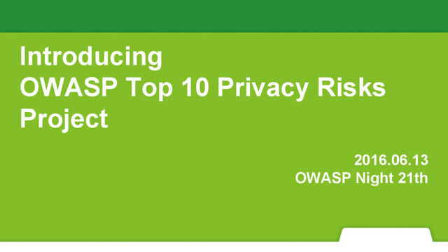 Privacy Top 10 Project (2014/2/28) ◦ OWASP Releases Its First Top 10 Privacy Risks (2014/9/23) ◦ OWASP Top 10 Privacy Risks Presented at Inaugural IPEN Workshop in Berlin (2014/10/7) ◦ On How OWASP Identifies Privacy Risks in Web Applications (2015/3/4)