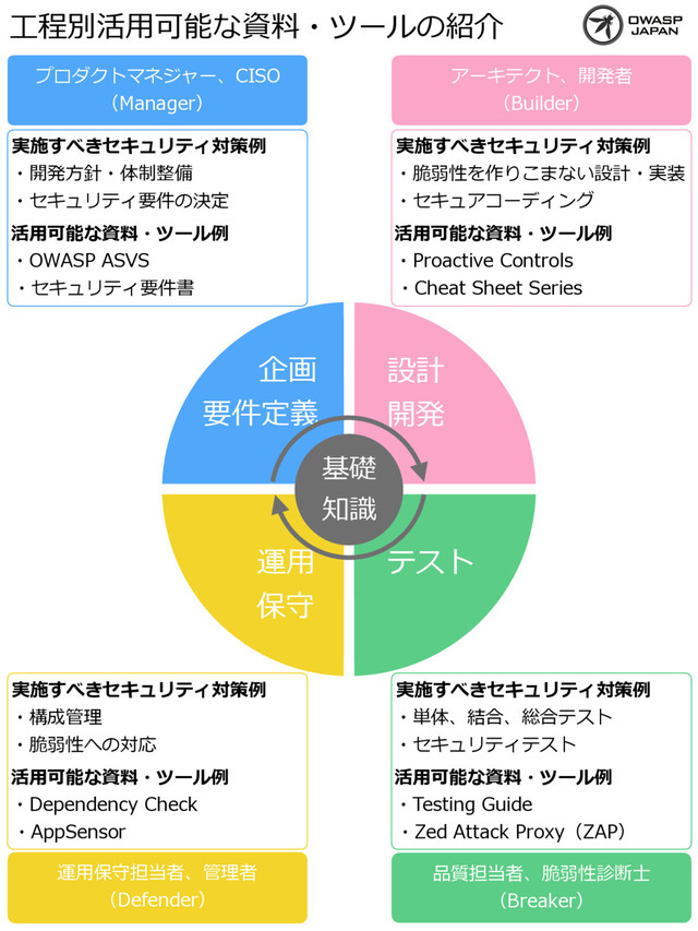 ない対処法を理解する ための資料。モバイル 版やIoT版も存在する 脆弱性の内容、確認⽅ 法、攻撃シナリオ、防 ⽌⽅法等を理解するた めに、企業における教 育や⾃⼰啓発等に活⽤ されている OWASP ASVS v3 組織におけるセキュリ ティに関する取組のレ ベルを設定し、そのレ ベルに応じた要件を実 現するのに活⽤するた めの資料 組織やシステムに対す るセキュリティレベル の状況の確認に加え、 その状況を証明する際 のエビデンスの作成に も活⽤されている セキュリティ要件書 v2 ウェブアプリに対して ⼀般的に盛り込むべき と考えられるセキュリ ティ要件を理解するた めの資料 ウェブアプリの要件定 義⼯程におけるセキュ リティ要件の策定に活 ⽤されている Open SAMM v1 ⼯程ごとに組織が直⾯ するリスクに応じたセ キュリティ対策の策 定・実施を⽀援するた めの資料。最新版は v1.1 組織におけるセキュリ ティ対策の策定に活⽤ されている Manager Builder Breaker Defender Manager Builder Manager Builder 活⽤可能な主要な資料・ツールの⼀覧 Manager Builder Breaker Defender :資料 :ツール :⽇本語 :英語
