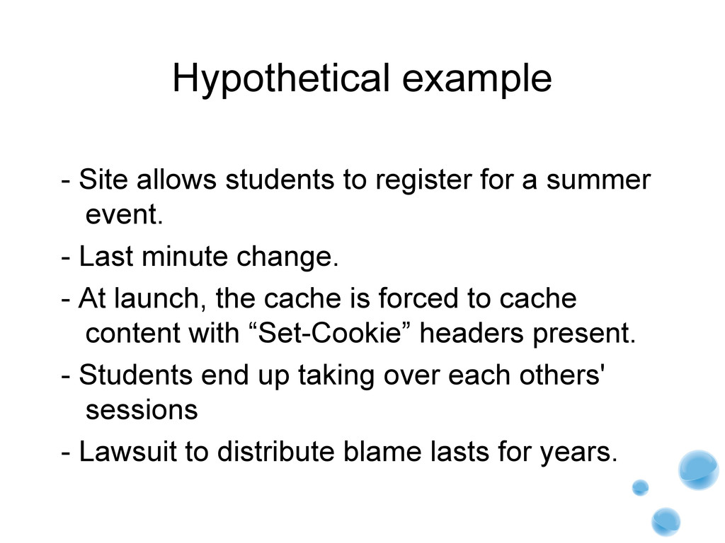 This talk will discuss caching from app server to web browser. Subjects like s-maxage vs. max-age, little known obscurities around the Vary header and more will be covered. The talk focuses on using simple, safe strategies that don't lead to information leakage even when things go wrong. There will be some Varnish-specific tips and tricks.