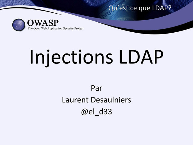 Présentation sur les injections LDAP. Cette courte présentation décrira les différents types d'injection LDAP, les subtilités au niveau des filtres et les différentes technologies de LDAP. La présentation sera aussi complémentée d'exemples tirés de la compétition NorthSec, afin de démontrer les différents exploits.