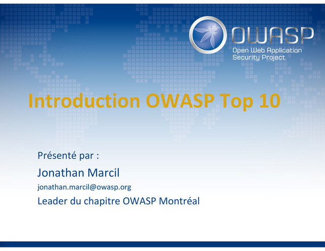 Présentation du nouveau OWASP Top 10 2013 et introduction à OWASP. L'objectif principal du Top 10 de l'OWASP est de sensibiliser les développeurs, concepteurs, architectes, décideurs, et les entreprises aux conséquences des faiblesses les plus importantes inhérentes à la sécurité des applications web. Le Top 10 fournit des techniques de base pour se protéger contre ces domaines problématiques à haut risque – et fournit des conseils sur la direction à suivre.