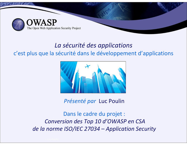 BIO: M. Poulin compte plus de trente années d'expérience en informatique, durant lesquelles il a acquis une solide expertise en technologie des systèmes et en génie logiciel. Il se spécialise en gestion, implantation et évaluation de la sécurité globale de systèmes informatiques, à l'intérieur d'environnements de développement et d’opération d'applications. Il est un membre du groupe de travail canadien WG D – Security Controls and Services au sous-comité sur la sécurité de l’information (SC 27) du comité conjoint ISO JTC 1, et corédacteur de la norme ISO/IEC 27034 – Sécurité des applications.
