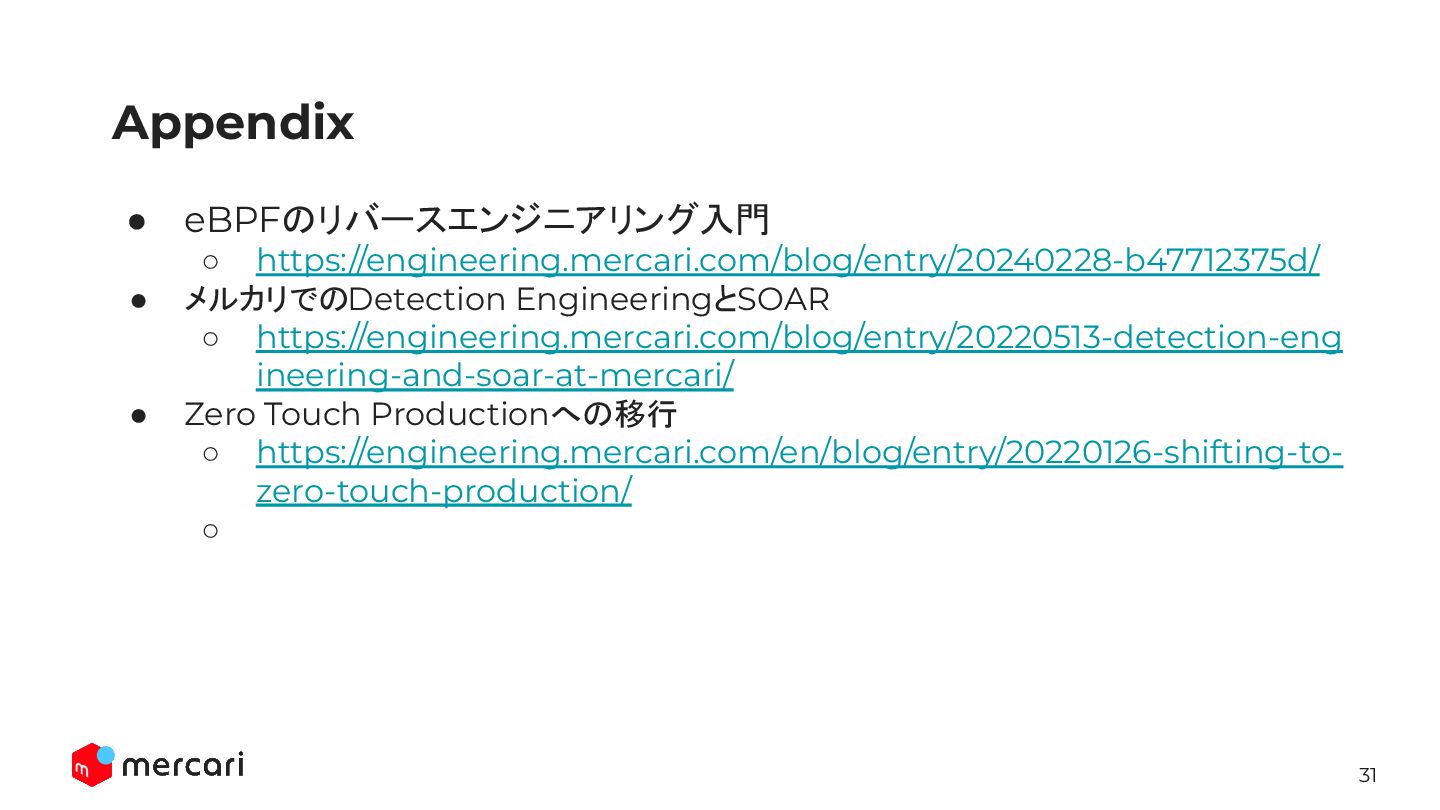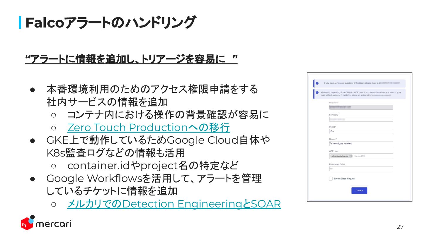 大規模なCloud Native環境において、リアルタイム脅威検知エンジン「Falco」をいかに運用し、セキュリティを確保するか。 本講演では、多様なマイクロサービスやGKEクラスターが混在するメルカリ環境での具体的な運用戦略に焦点を当てます。 自動化されたクラスター登録・ルールデプロイメントの仕組み、誤検知を防ぐためのルール管理の構造化、そしてインシデント対応を効率化するアラートへのコンテキスト追加手法など、大規模環境特有の課題を解決する実践的なノウハウを幅広くご紹介します。