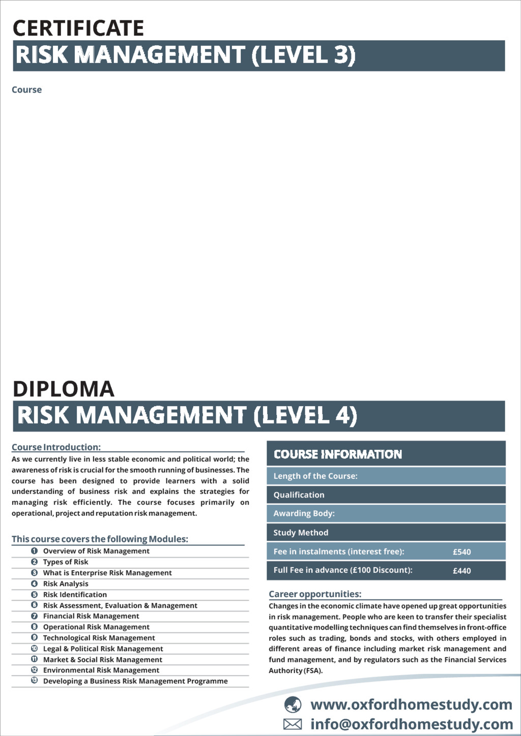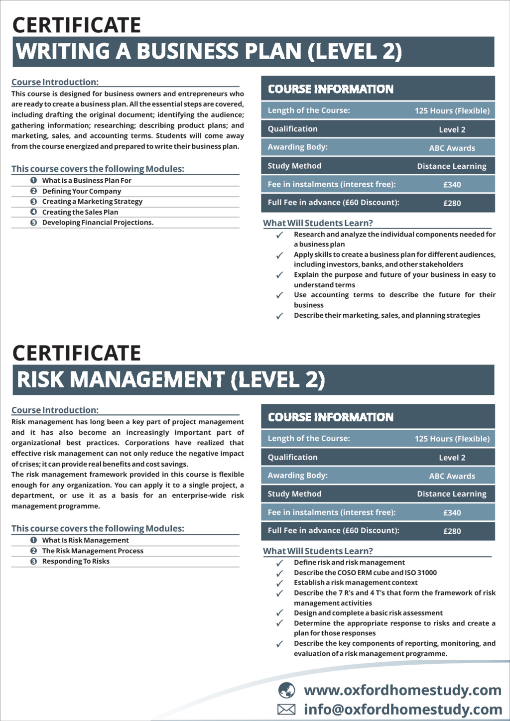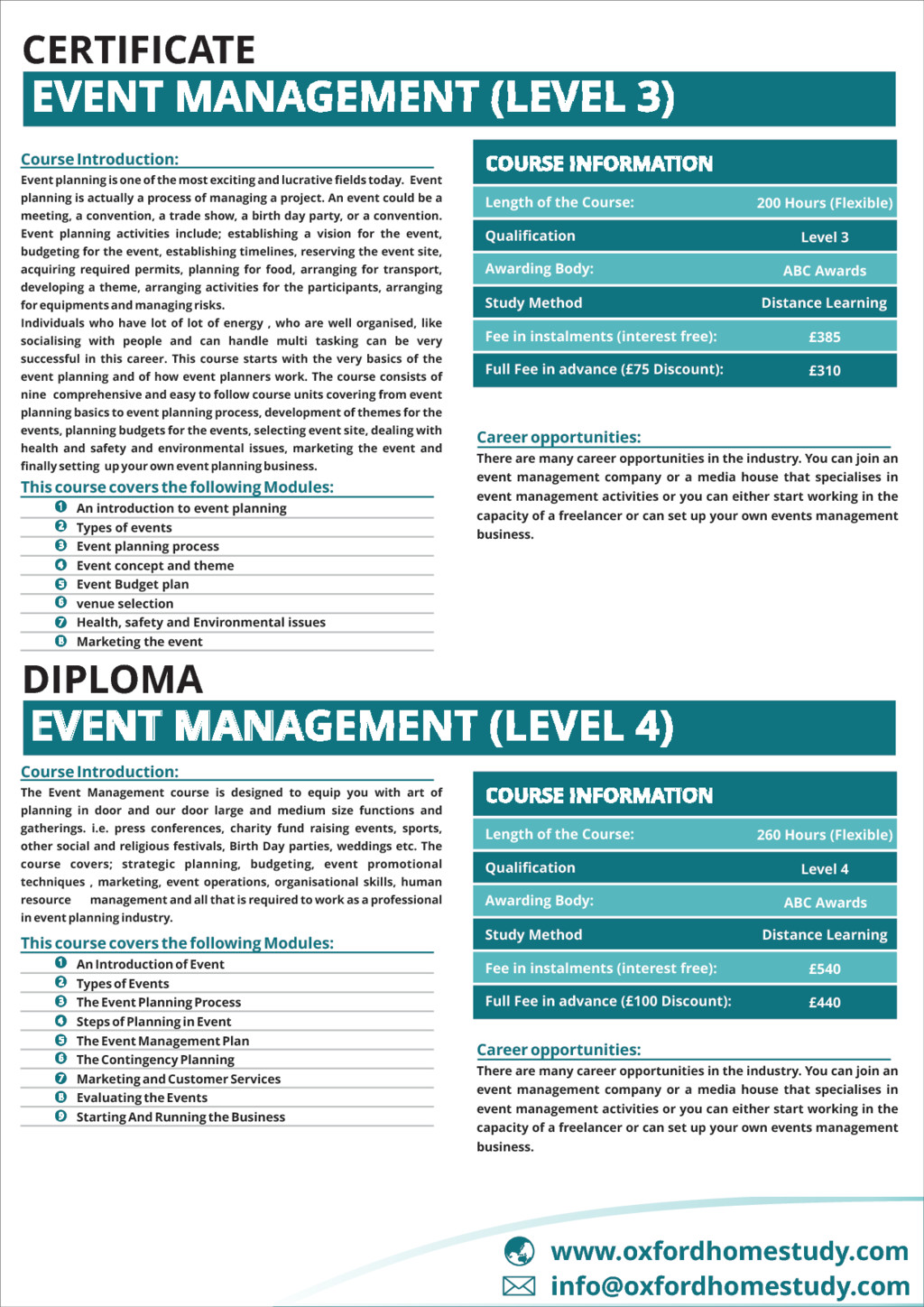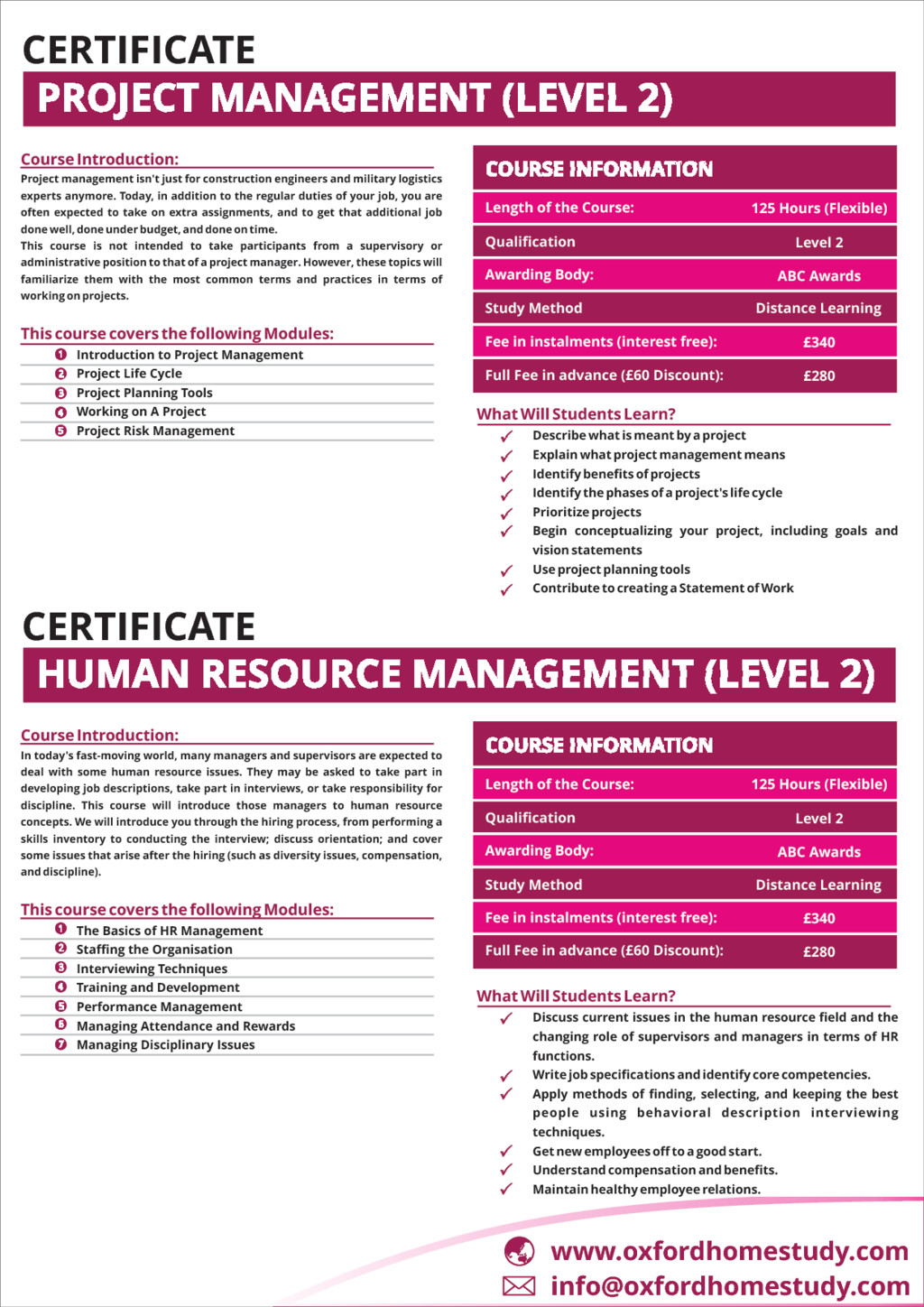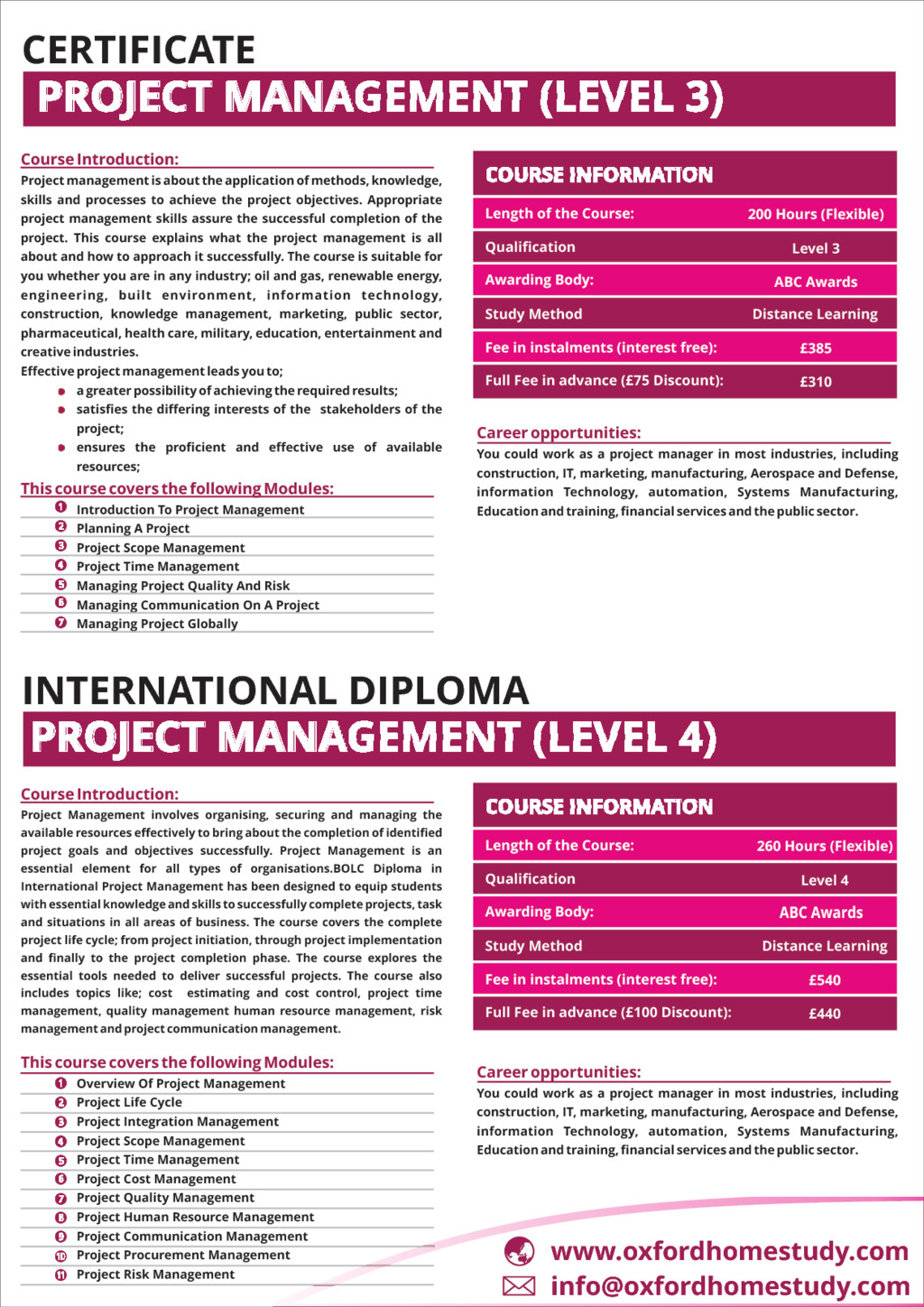 managing the available resources effectively to bring about the completion of identified project goals and objectives successfully. Project Management is an essential element for all types of organisations.BOLC Diploma in International Project Management has been designed to equip students with essential knowledge and skills to successfully complete projects, task and situations in all areas of business. The course covers the complete project life cycle; from project initiation, through project implementation and finally to the project completion phase. The course explores the essential tools needed to deliver successful projects. The course also includes topics like; cost estimating and cost control, project time management, quality management human resource management, risk management and project communication management. This course covers the following Modules: Overview Of Project Management Project Life Cycle Project Integration Management Project Scope Management Project Time Management Project Cost Management Project Quality Management Project Human Resource Management Project Communication Management Project Procurement Management Project Risk Management Career opportunities: You could work as a project manager in most industries, including construction, IT, marketing, manufacturing, Aerospace and Defense, information Technology, automation, Systems Manufacturing, Education and training, financial services and the public sector. PROJECT MANAGEMENT (LEVEL 4) www.oxfordhomestudy.com