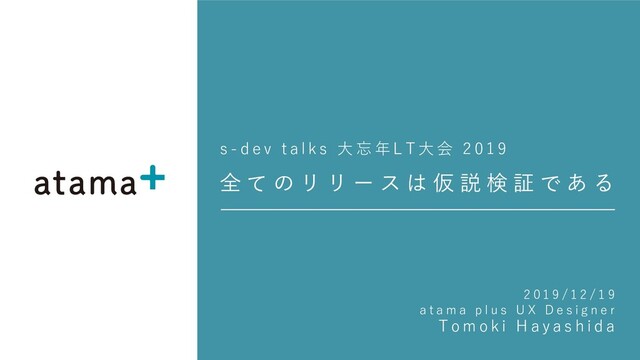 s ⼤ 忘 年 L T ⼤ 会 2 0 1 9 全 て の リ リ ー ス は 仮 説 検 証 で あ る 2 0 1 9 / 1 2 / 1 9 a t a m a p l u s U X D e s i g n e r T o m o k i H a y a s h i d a