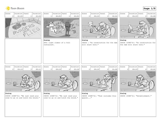 "This place has seen better days." Scene 3 Duration 09:15 Panel 2 Duration 02:04 Dialog DON: "This place has seen better days." Scene 3 Duration 09:15 Panel 3 Duration 01:10 Dialog DON (CONT'D): "But this is an institution, Chuck." Scene 3 Duration 09:15 Panel 4 Duration 00:18 Dialog DON (CONT'D): "But this is an institution, Chuck." Scene 3 Duration 09:15 Panel 5 Duration 00:23 Dialog DON (CONT'D): "But this is an institution, Chuck." Scene 3 Duration 09:15 Panel 6 Duration 03:08 Dialog CHUCK (OS): "Included would be an advance in your share." Scene 4 Duration 03:01 Panel 1 Duration 03:01 Dialog CHUCK (OS): "And extra for the... demolition job." Scene 5 Duration 04:00 Panel 1 Duration 01:15 Page 2/8